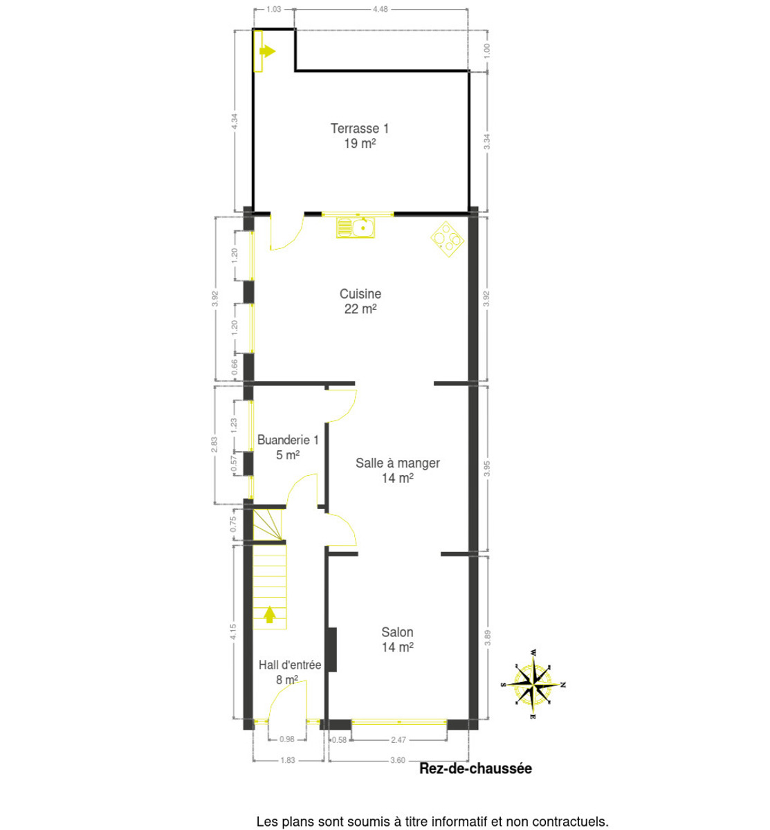 Le bien se compose au rez-de-chaussée d'un hall d'entrée, d'un séjour avec cuisine ouverte et équipée donnant accès à la terrasse couverte ainsi que d'une buanderie.