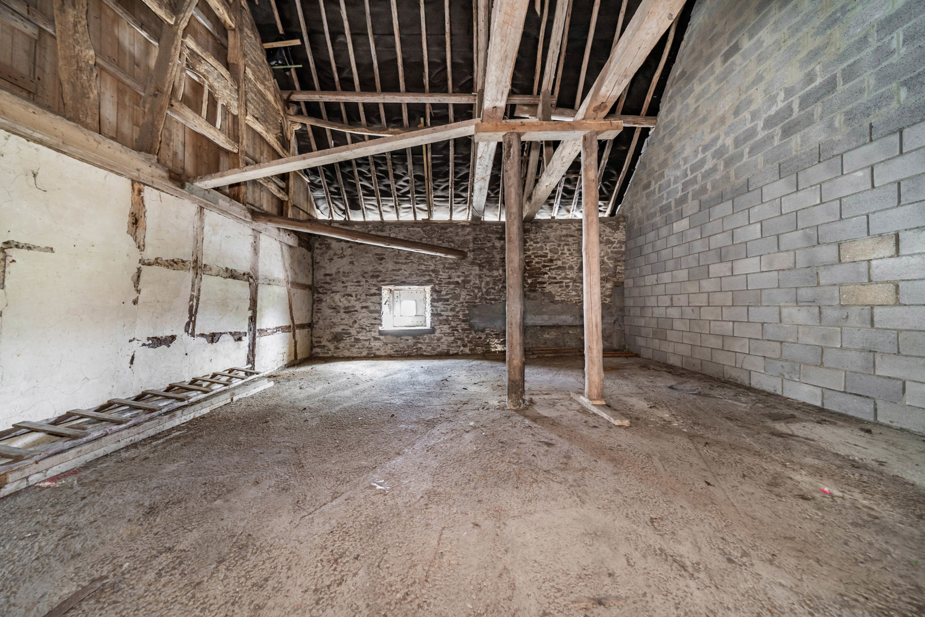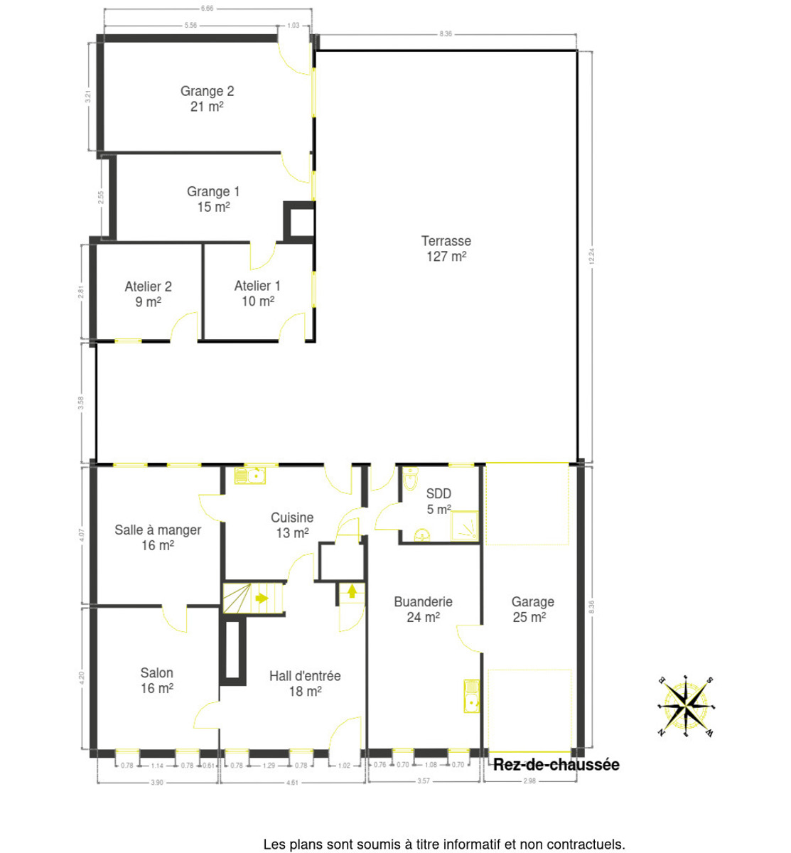 Le rez-de-chaussée est composé d'un grand hall d'entrée, d'un salon, d'une salle à manger, d'une cuisine donnant accès à l'extérieur, d'une salle de bains, ainsi que d'un espace polyvalent (atelier) avec garage traversant donnant accès à la cour arrière. A l'étage, un palier (bureau) dessert trois chambres. Un grand grenier et un fenil aménageables (Poss. chambres), des caves voûtées, une étable et un jardin avec cour orienté Sud-Est complètent l'ensemble.