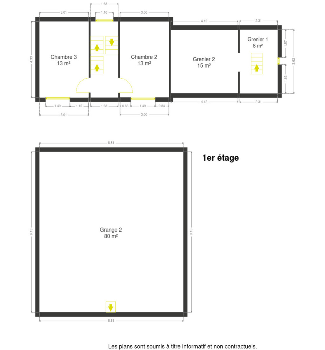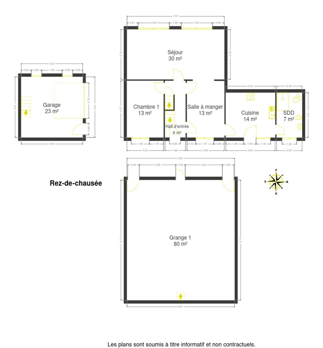 Le corps de logis se compose au rez-de-chaussée d'un hall d'entrée, d'une cuisine, d'un salon-salle à manger, d'une salle de bains ainsi que d'une chambre. Au premier et deuxième étage, le hall de nuit dessert quatre chambres. Une grange de 80 m², des caves et un garage complètent l'ensemble. Le jardin et la cour d'une superficie totale d'environ 900m² entourent le bâtiment.