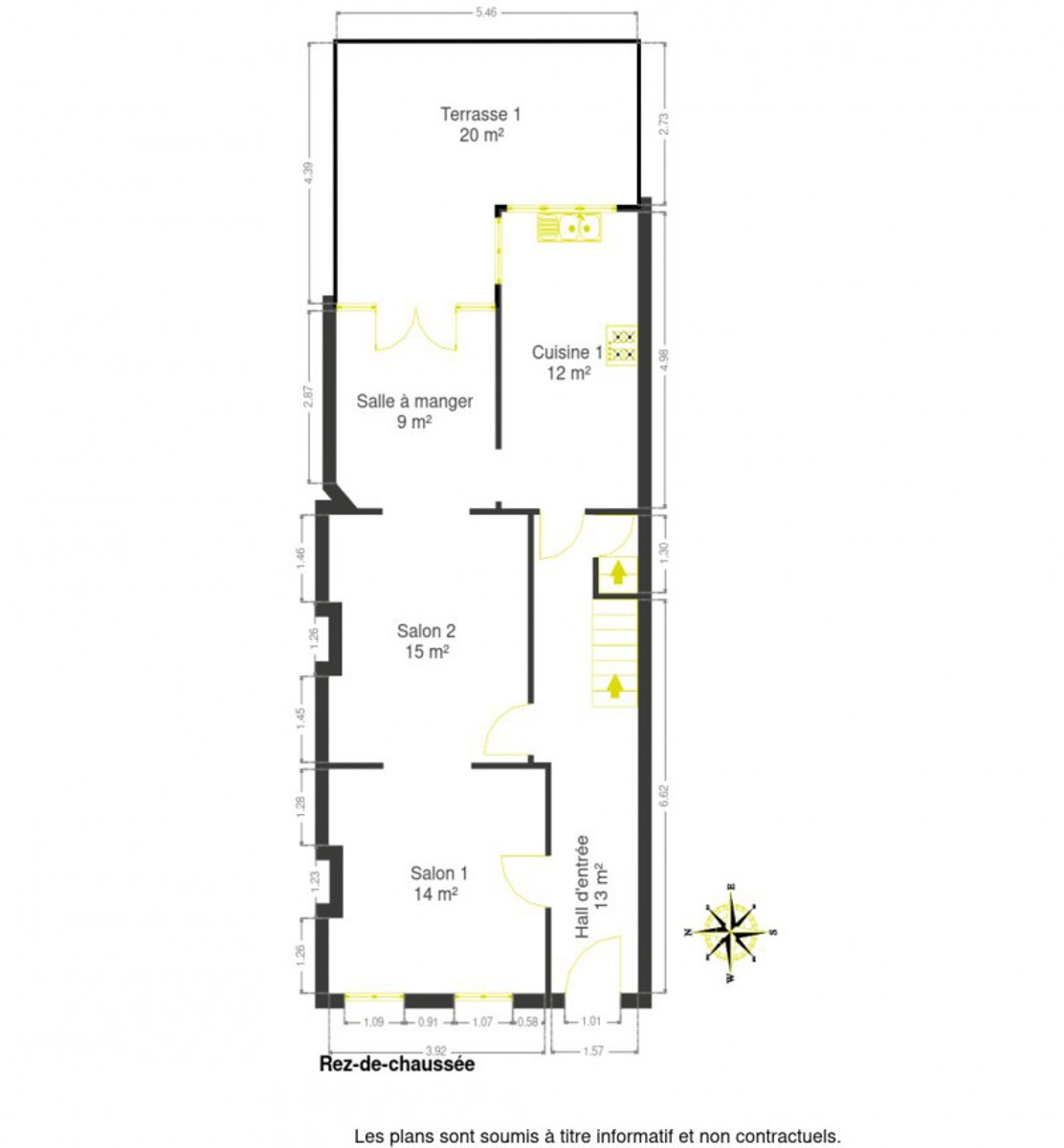 Le rez-de-chaussée est composé d'un grand hall d'entrée, d'un séjour, d'une cuisine et d'une salle à manger ouverte sur le jardin.