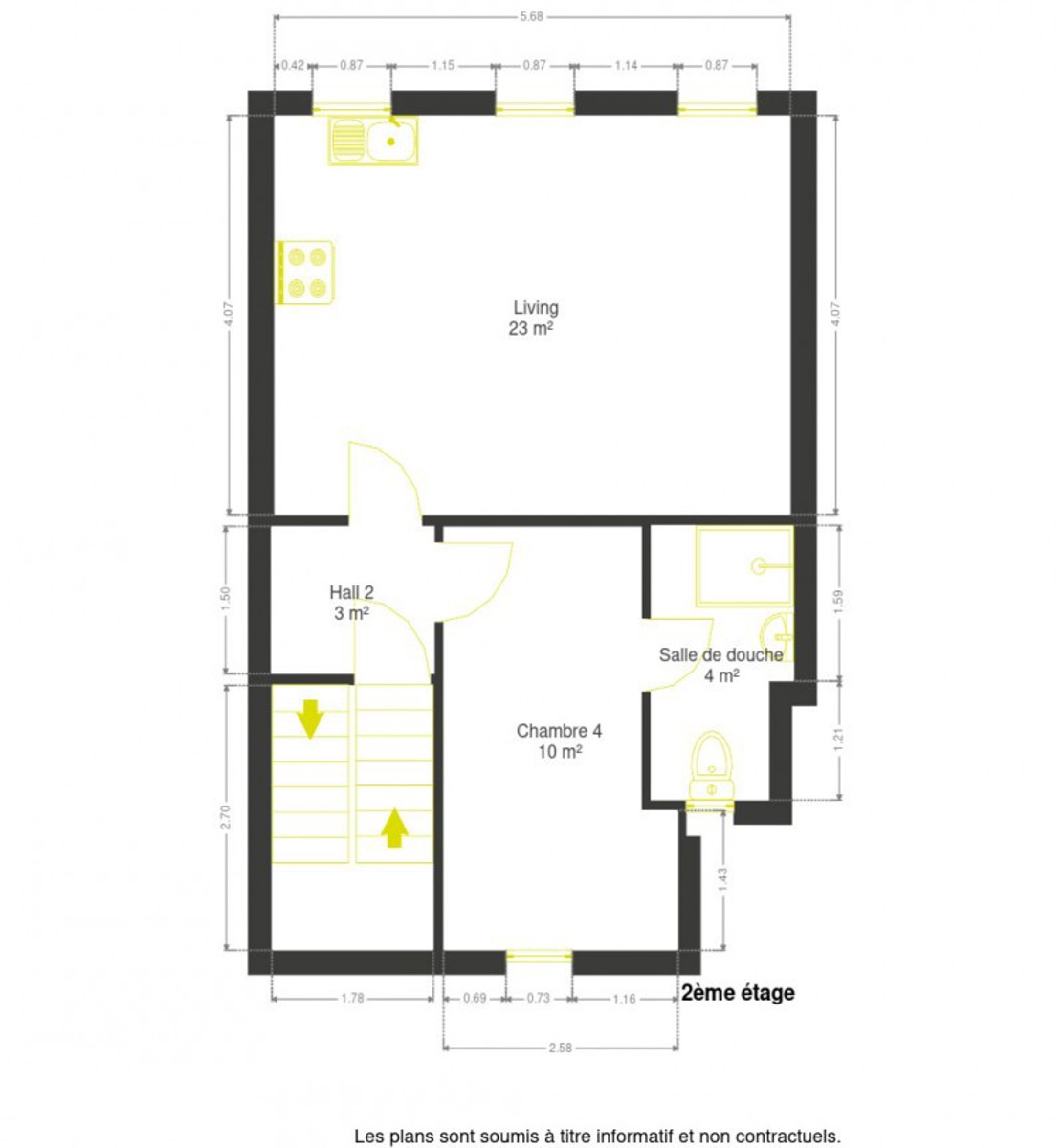 Au premier étage, un palier dessert une salle de bains, un WC indépendant, deux chambres et un bureau (poss. chambre). Le deuxième étage se compose quant à lui d'un salon avec cuisine (poss. chambre), d'une chambre et d'une salle de bains. Des caves, une terrasse et un jardin complètent l'ensemble.