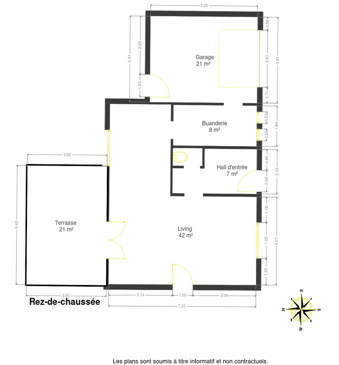 Die Immobilie besteht im Erdgeschoss aus einer Eingangshalle mit WC, einem hellen Wohnzimmer mit offener Küche, einem Waschraum sowie einer Garage. Im Obergeschoss befinden sich 3 Schlafzimmer und ein Badezimmer. Ein Garten mit Terrasse sowie ein Dachboden (Zimmer) vervollständigen das Ensemble.