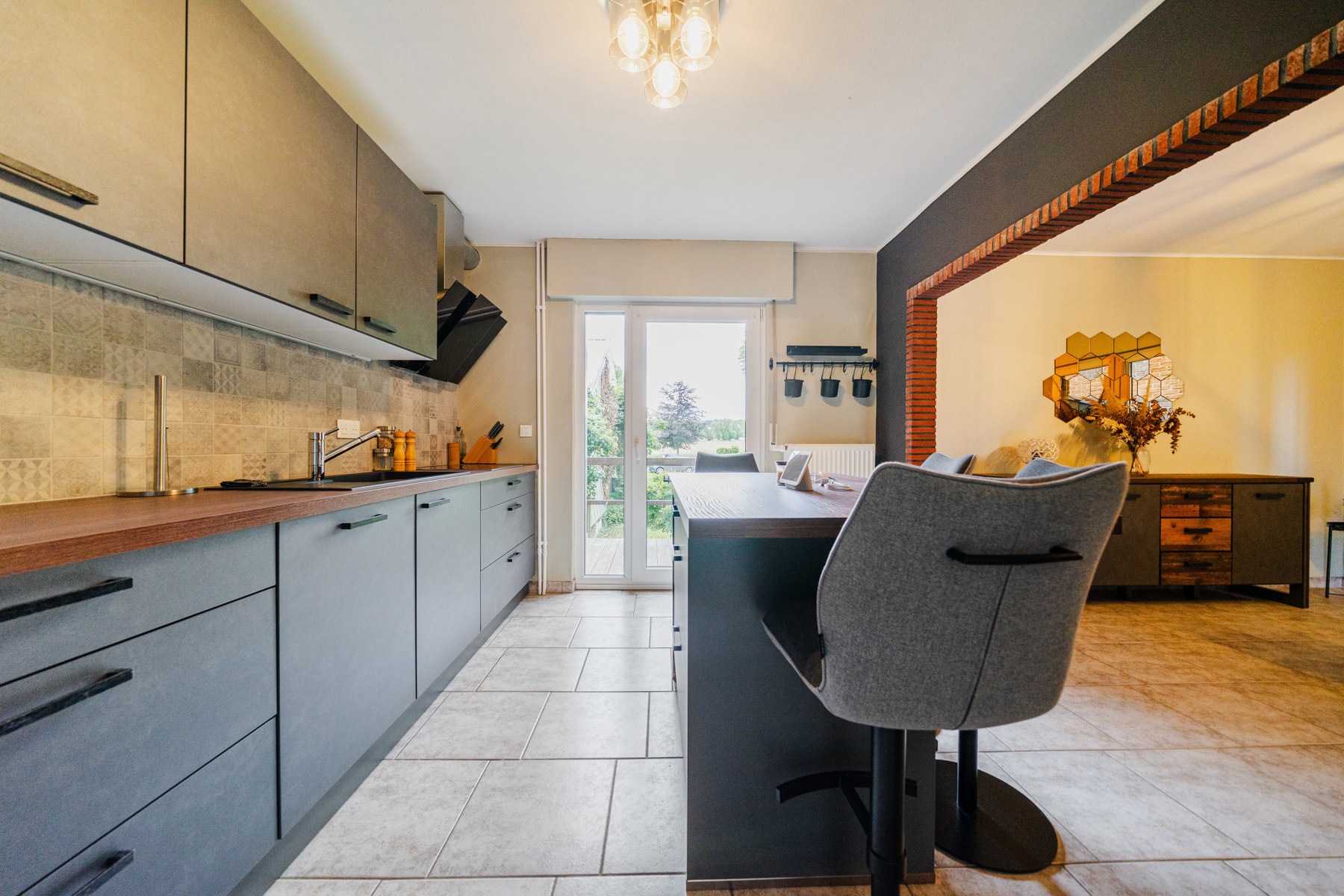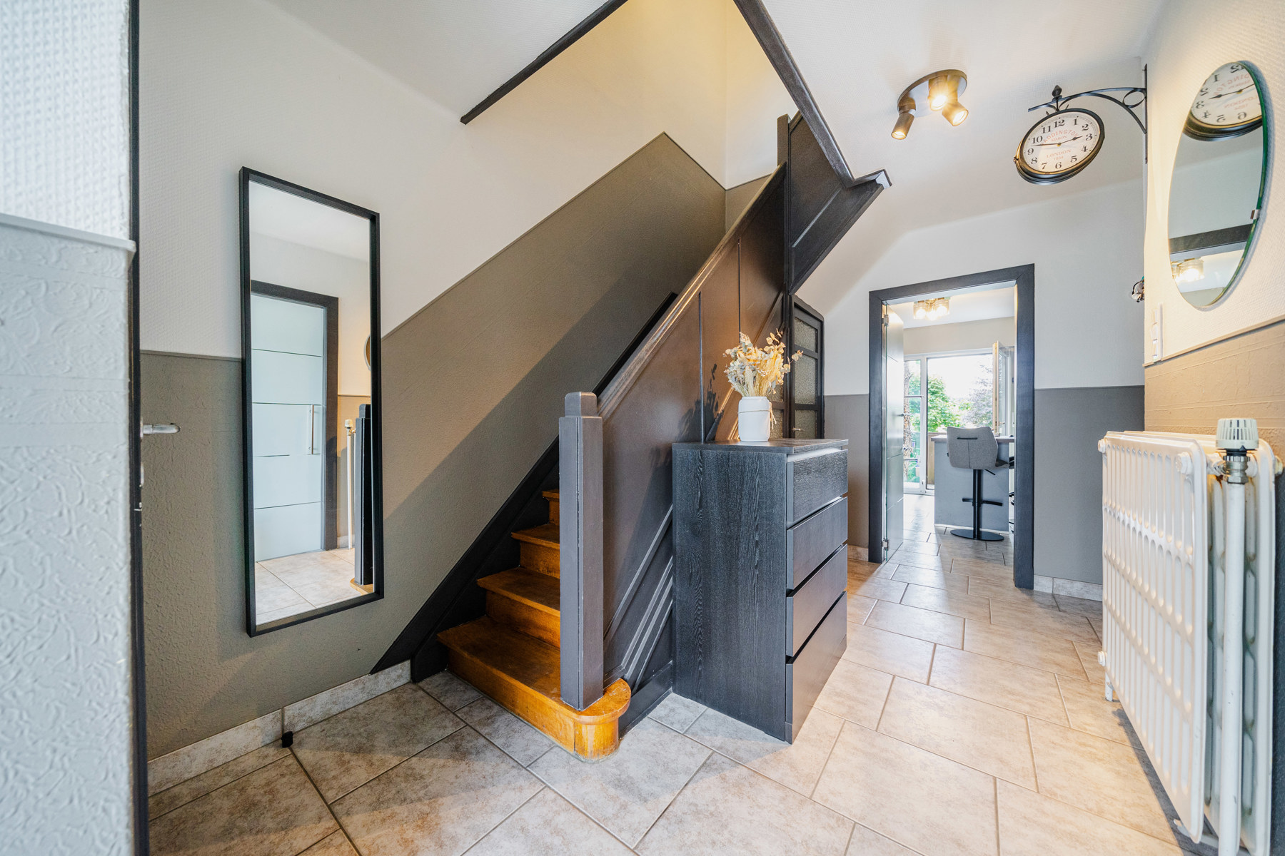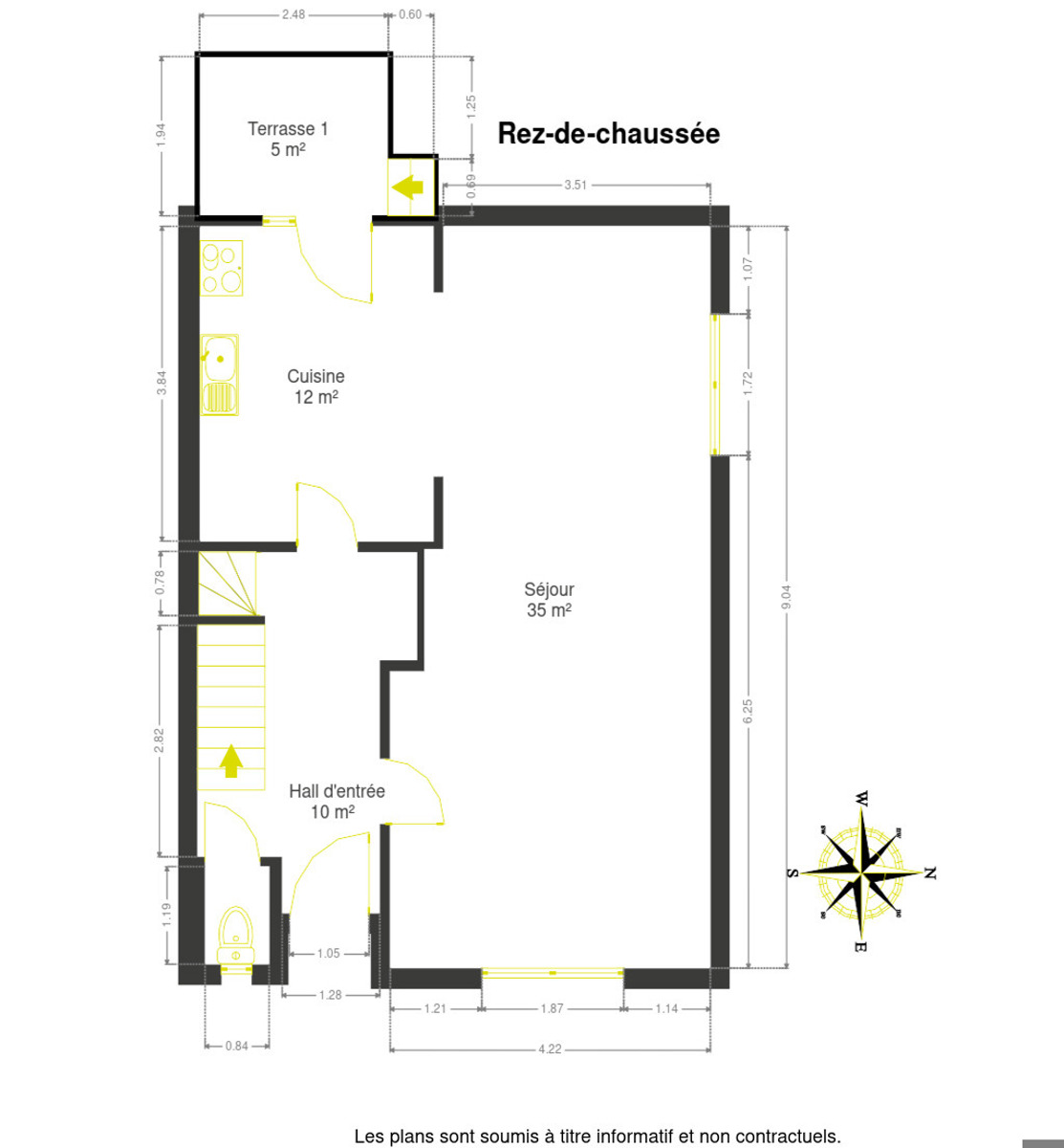 Celle-ci se compose au rez-de-chaussée d'un hall d'entrée avec WC ainsi que d'un grand salon-salle à manger ouvert sur la cuisine avec accès à la terrasse et au jardin.