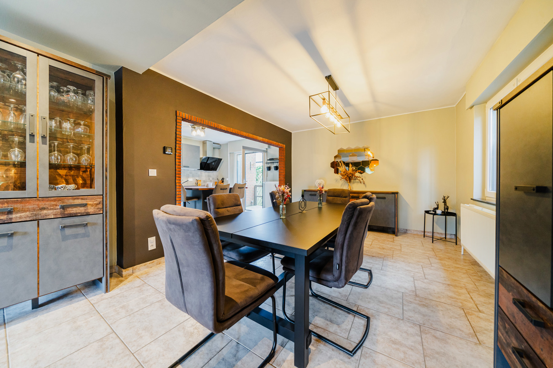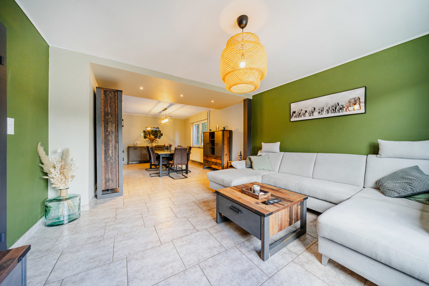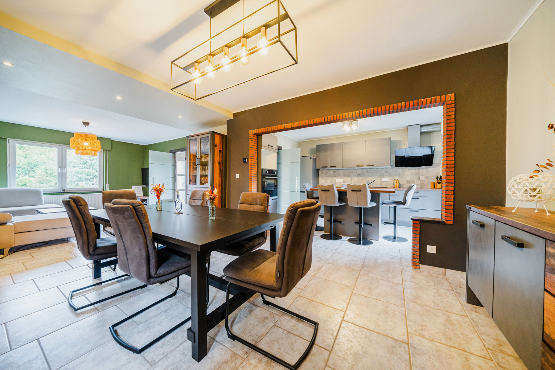 Celle-ci se compose au rez-de-chaussée d'un hall d'entrée avec WC ainsi que d'un grand salon-salle à manger ouvert sur la cuisine avec accès à la terrasse et au jardin.