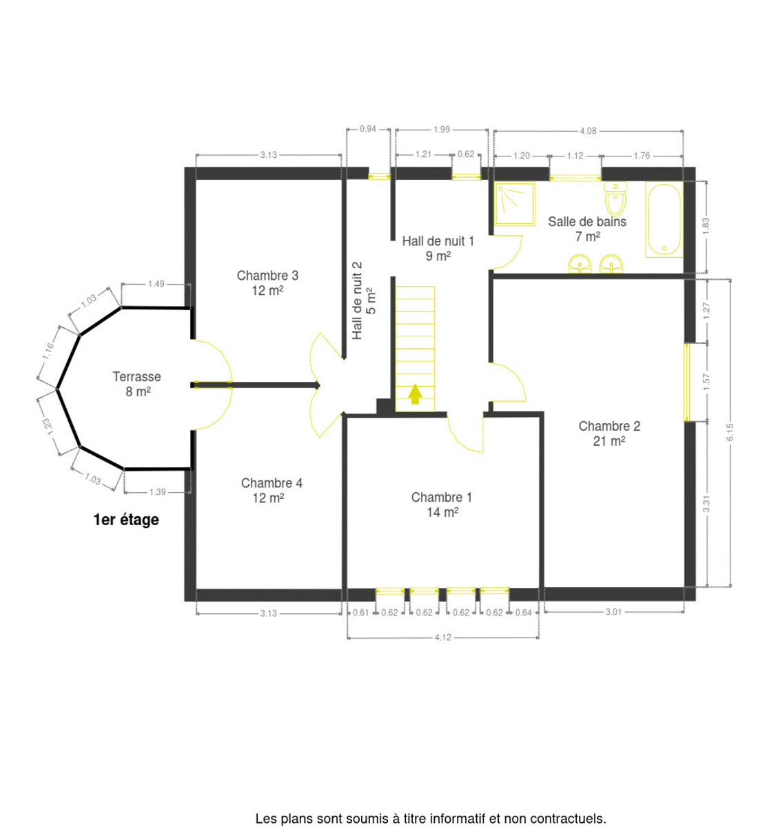 Das Haus besteht im Erdgeschoss aus einem Eingangsbereich mit WC, einer Küche, einem Esszimmer, einem Wohnzimmer, einem Büro sowie einem Schlafzimmer (mögliche freiberufliche Nutzung). Im Obergeschoss führt ein Flur zu vier Schlafzimmern, von denen zwei Zugang zur Terrasse haben, und einem Badezimmer.