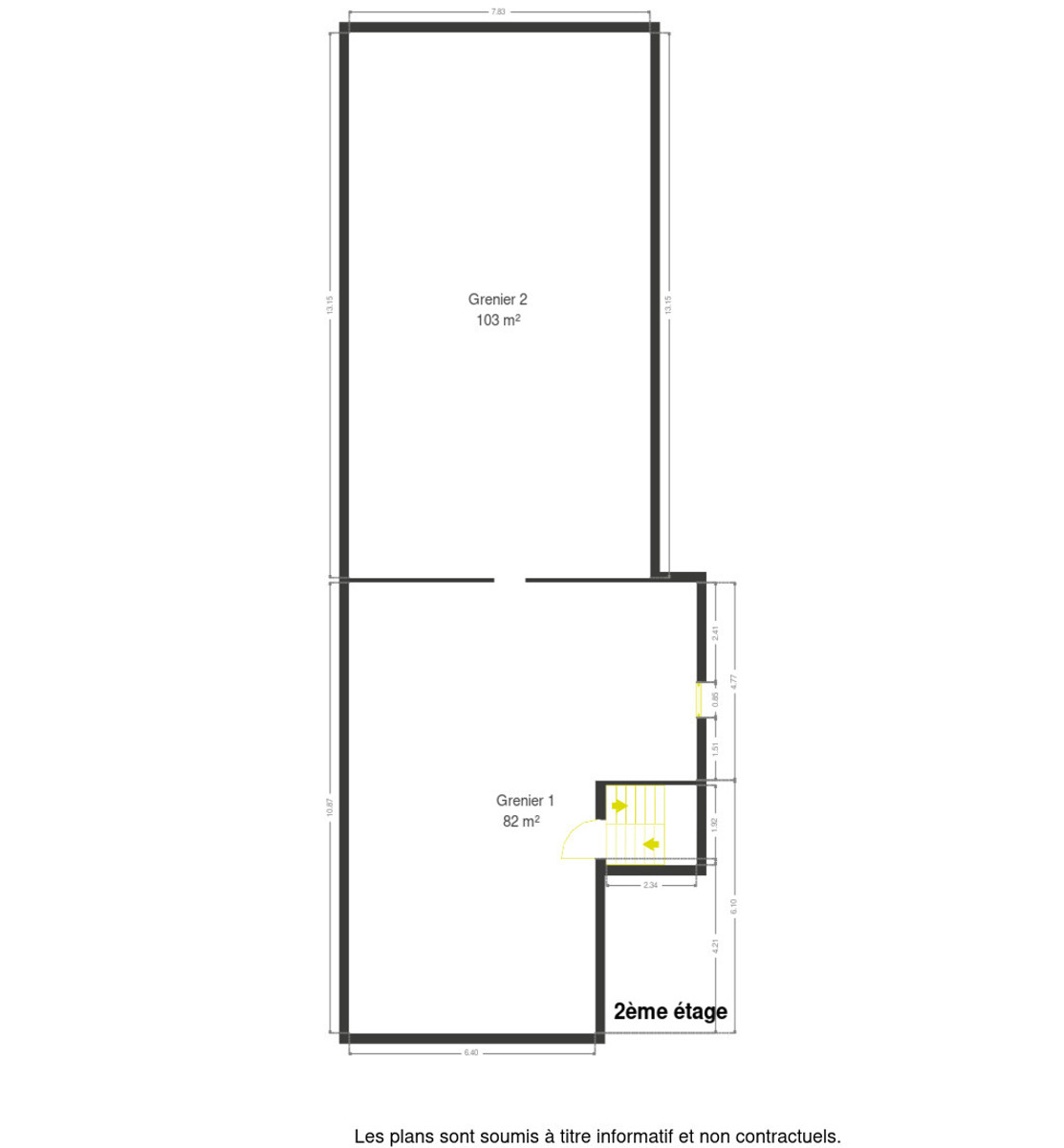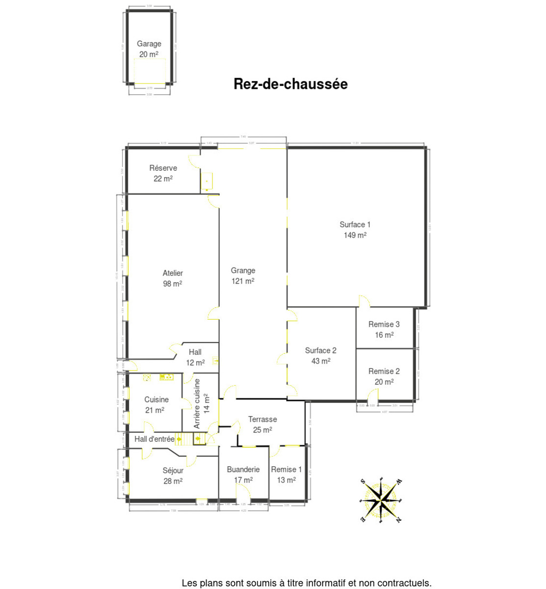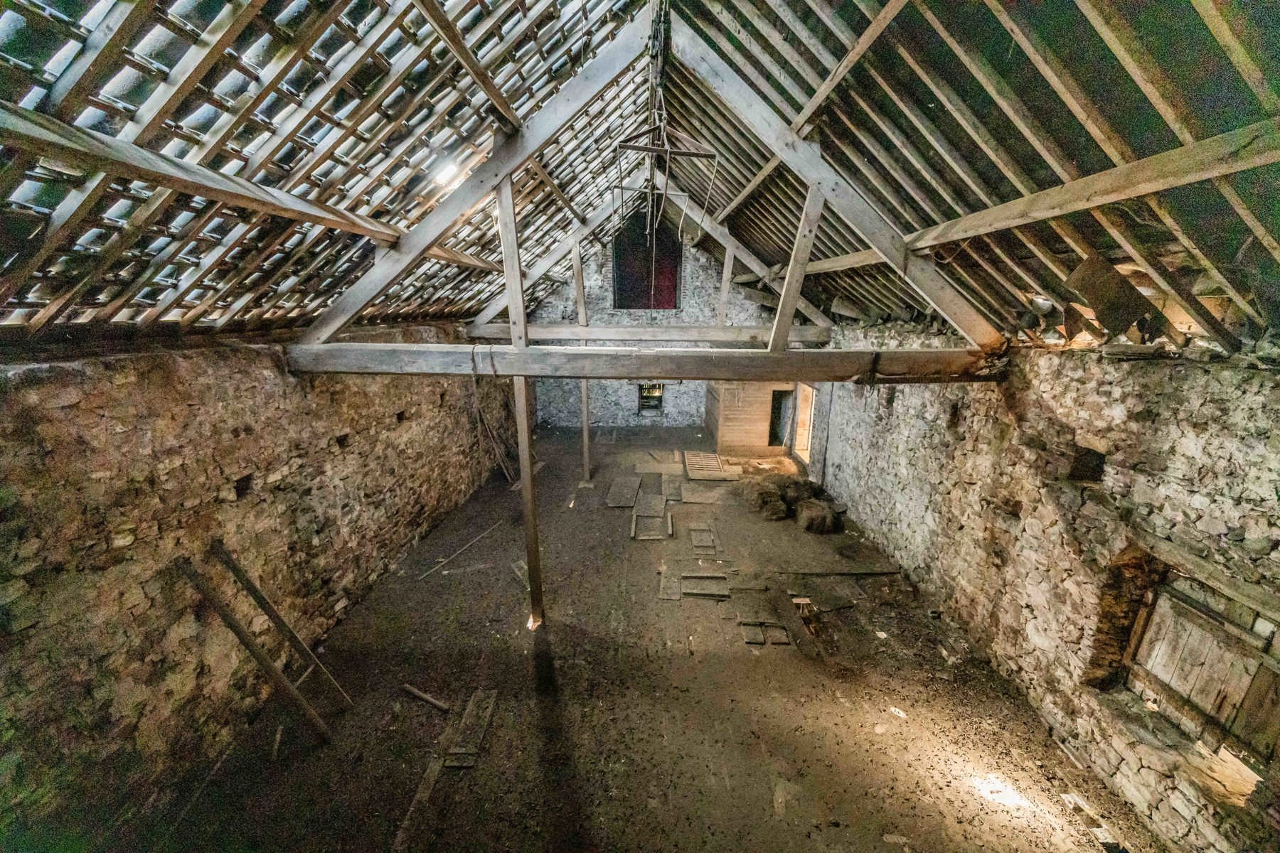 Le corps de logis se compose au rez-de-chaussée de deux halls d'entrée, d'un séjour, d'une cuisine avec salle à manger et d'une buanderie donnant accès au jardin. A l'étage, le hall de nuit dessert quatre chambres et une salle de bains. Un grand atelier de 98 m², des caves ainsi qu'un grenier aménageable complètent cette partie. Divers étables pour une superficie de 350 m², un garage, ainsi que des fenils ouvrent la possibilité à tout type de projet (activité professionnelle, entreposage, etc.).