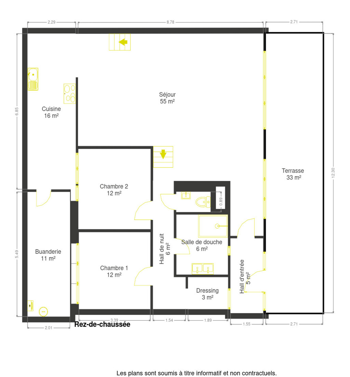 Ce bien se compose d'un hall d'entrée, d'un séjour ouvert sur une salle à manger, d'une cuisine équipée, d'une buanderie, de deux chambres, d'un espace dressing et d'une salle de douches. Une terrasse de 33m² et une place de parking privative complètent l'ensemble.