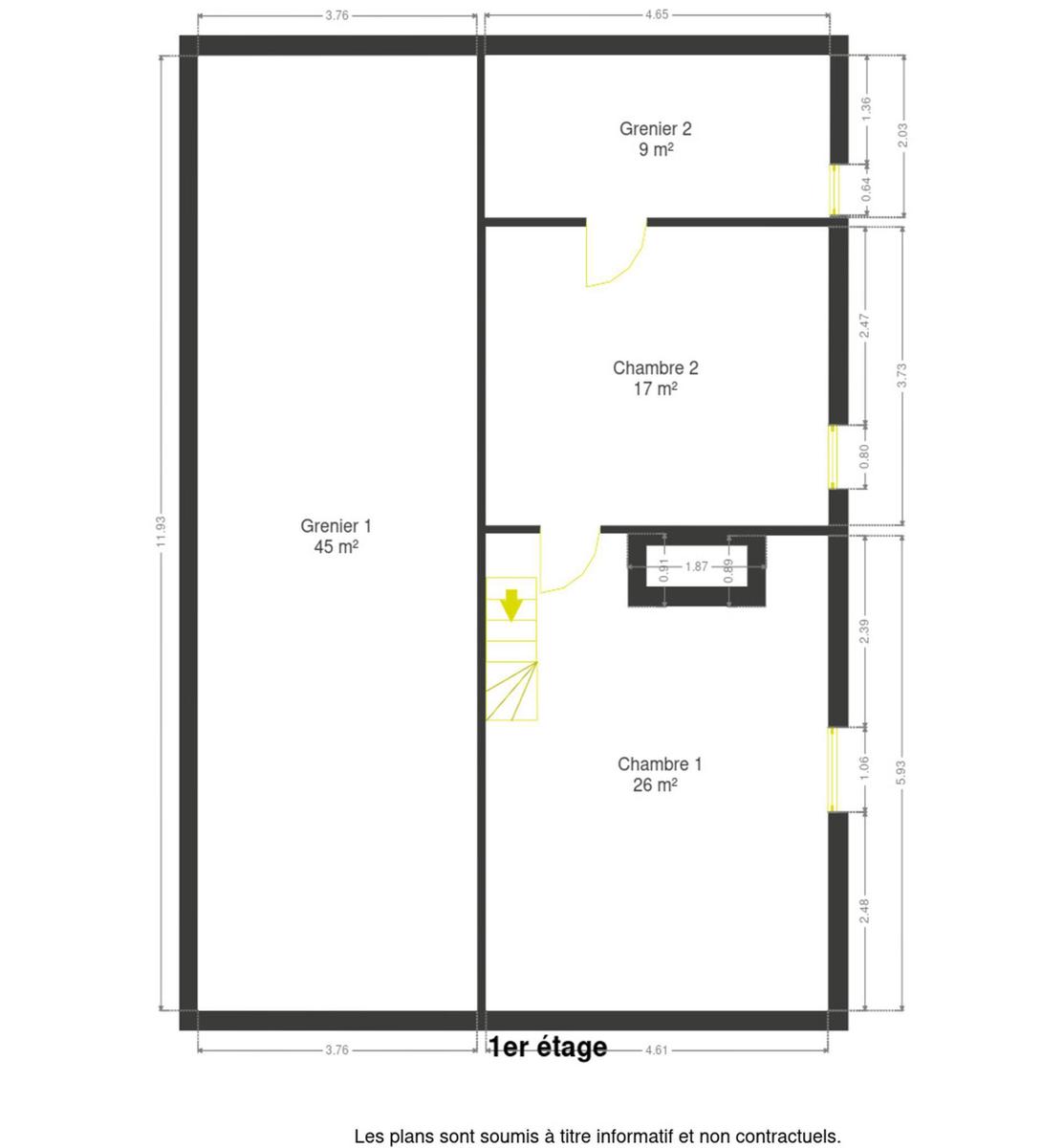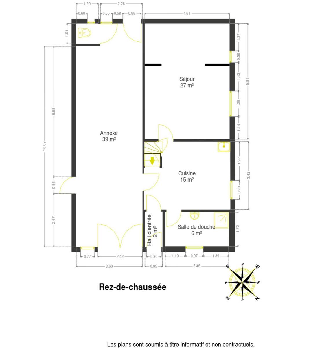 Le bien se compose au rez-de-chaussée d'un hall d'entrée, d'une cuisine, d'un salon, d'une salle à manger et d'une salle de bains. Au premier étage, l'escalier dessert deux chambres. Une cave, un grenier aménageable de 36 m², une étable de 39m², un fenil de 45m² et un jardin complètent l'ensemble.