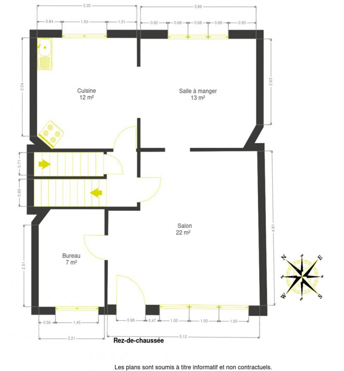 Le bien se compose au rez-de-chaussée d'un spacieux et lumineux salon, d'une salle à manger, d'une cuisine ainsi que d'une chambre (bureau). A l'étage, un palier dessert trois chambres, une salle de bains et un WC séparé. Des caves et un grenier complètent l'ensemble.