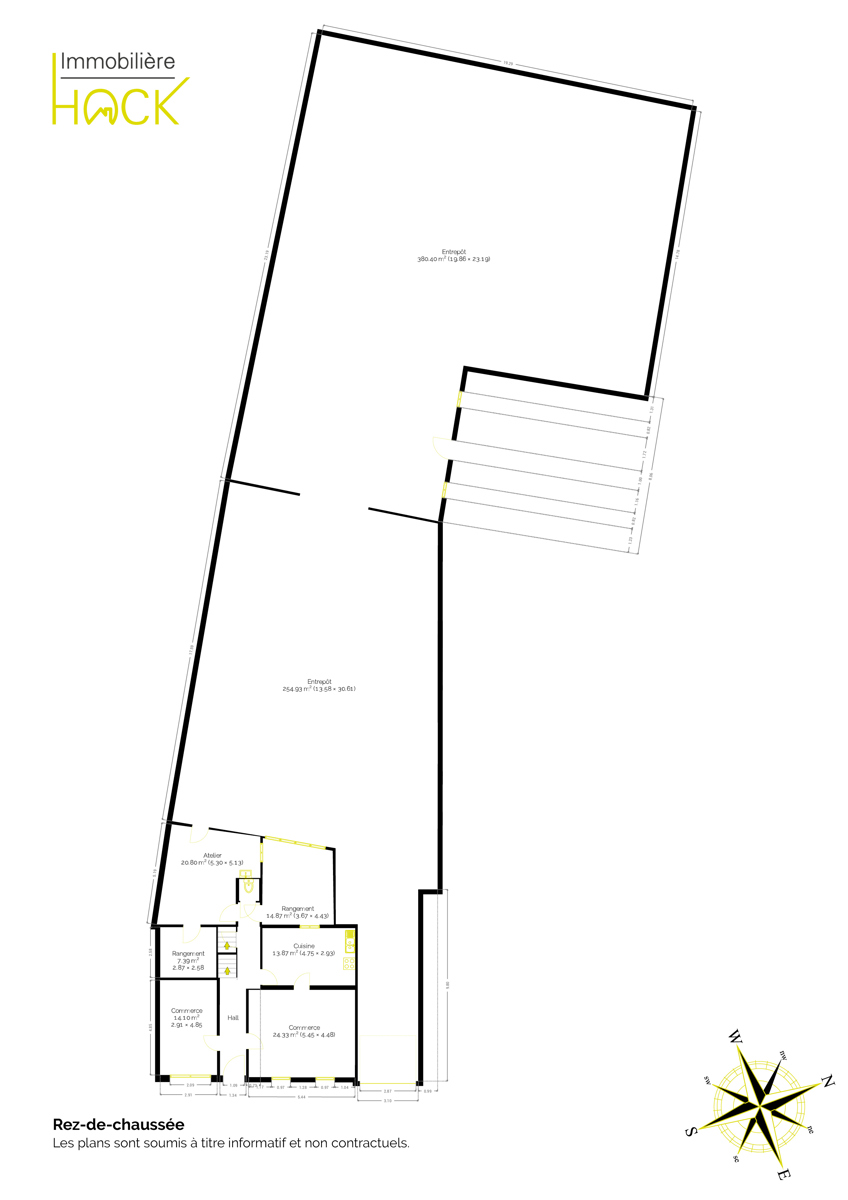 Des caves ainsi qu’un entrepôt d’environ 630 m², divisé en deux espaces et accessible par une porte électrique située sur le côté du bâtiment, complètent l’ensemble.