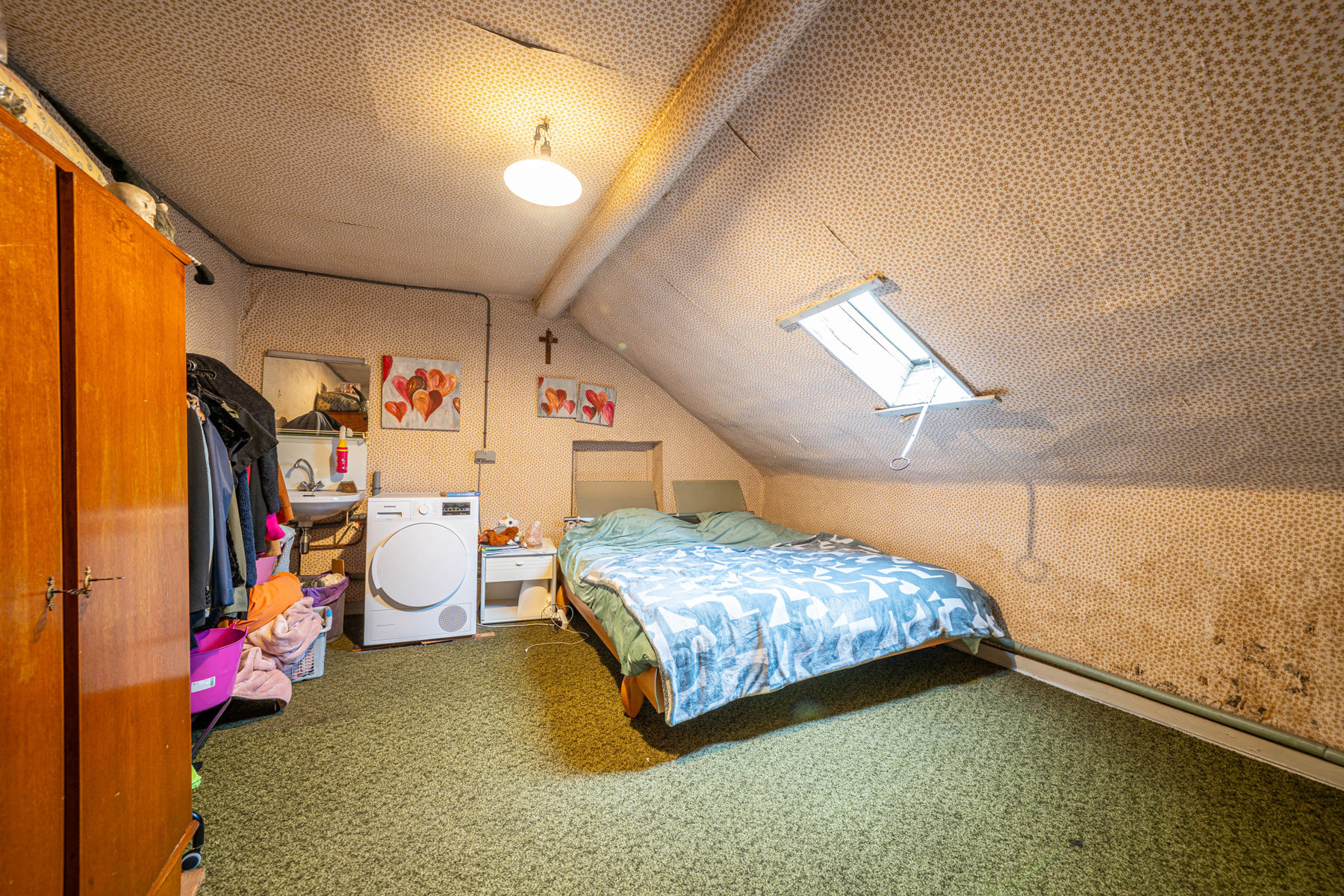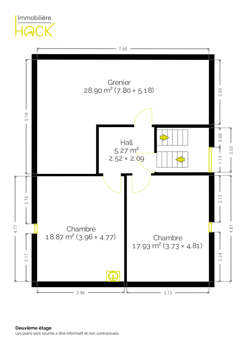 À l’étage, le palier dessert un séjour, une cuisine, deux chambres et une salle de bains. Au deuxième étage, le grenier est divisé en trois pièces pouvant être aménagées en chambres.