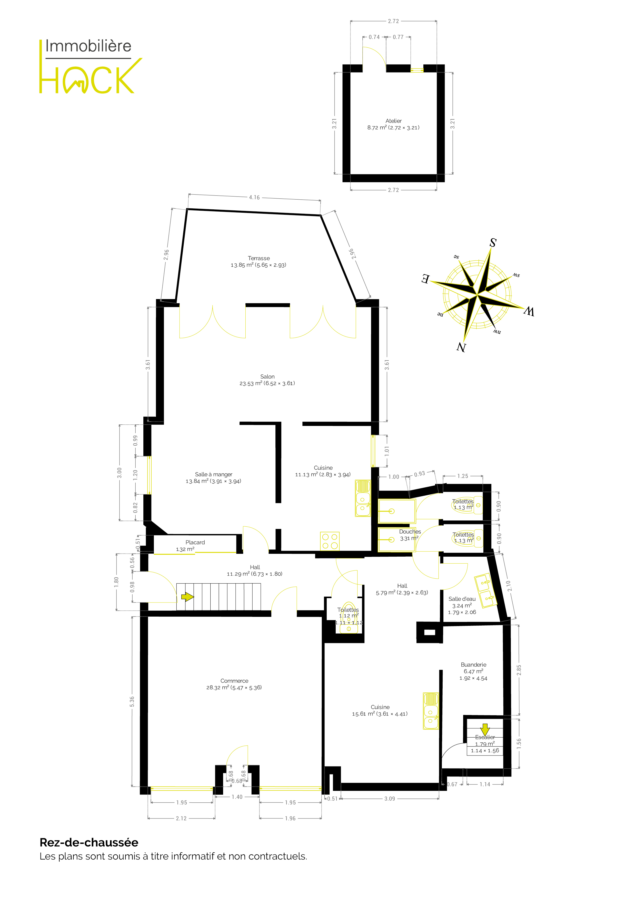 Ce bien se compose d’une partie commerciale avec accès indépendant comprenant une surface commerciale, un hall, une cuisine, une salle de douches ainsi qu’une buanderie. La partie habitation offre, au rez-de-chaussée, un hall d’entrée, un séjour, une salle à manger et une cuisine. L'étage dispose de quatre chambres et d'une salle de douches. Un grenier aménageable, une cave, une terrasse, un jardin et des emplacements de parking complètent l’ensemble.