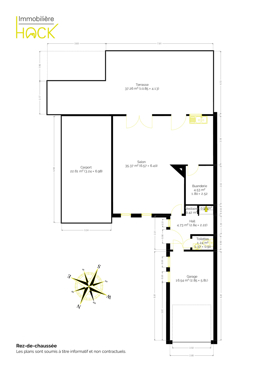 Ce bien se compose au rez-de-chaussée d'un hall d'entrée avec WC, d'un lumineux séjour ouvert sur une cuisine équipée et donnant accès à la terrasse (Sud-Est), d'une buanderie ainsi que d'un garage. A l'étage, le hall de nuit dessert trois chambres et une salle de bains. Un grenier, un jardin avec abri, un carport ainsi que de nombreuses places de parking complètent l'ensemble.