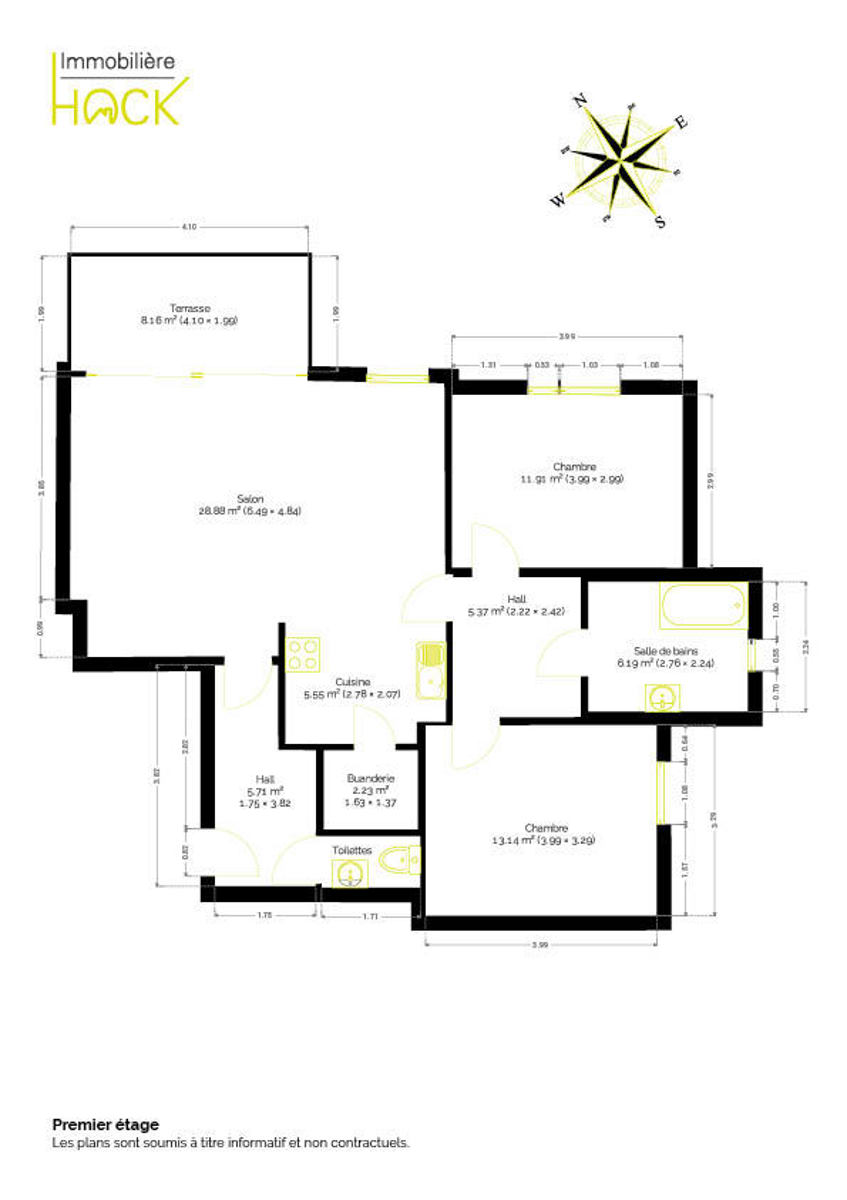 Au premier étage d’un immeuble avec ascenseur, ce bien se compose d’un hall d’entrée avec WC indépendant, d’un lumineux séjour donnant accès à la cuisine, d’une buanderie, ainsi que d’un hall de nuit desservant deux chambres et une salle de bains avec baignoire. Une terrasse, une cave en sous-sol et un emplacement de parking privatif complètent l’ensemble.
