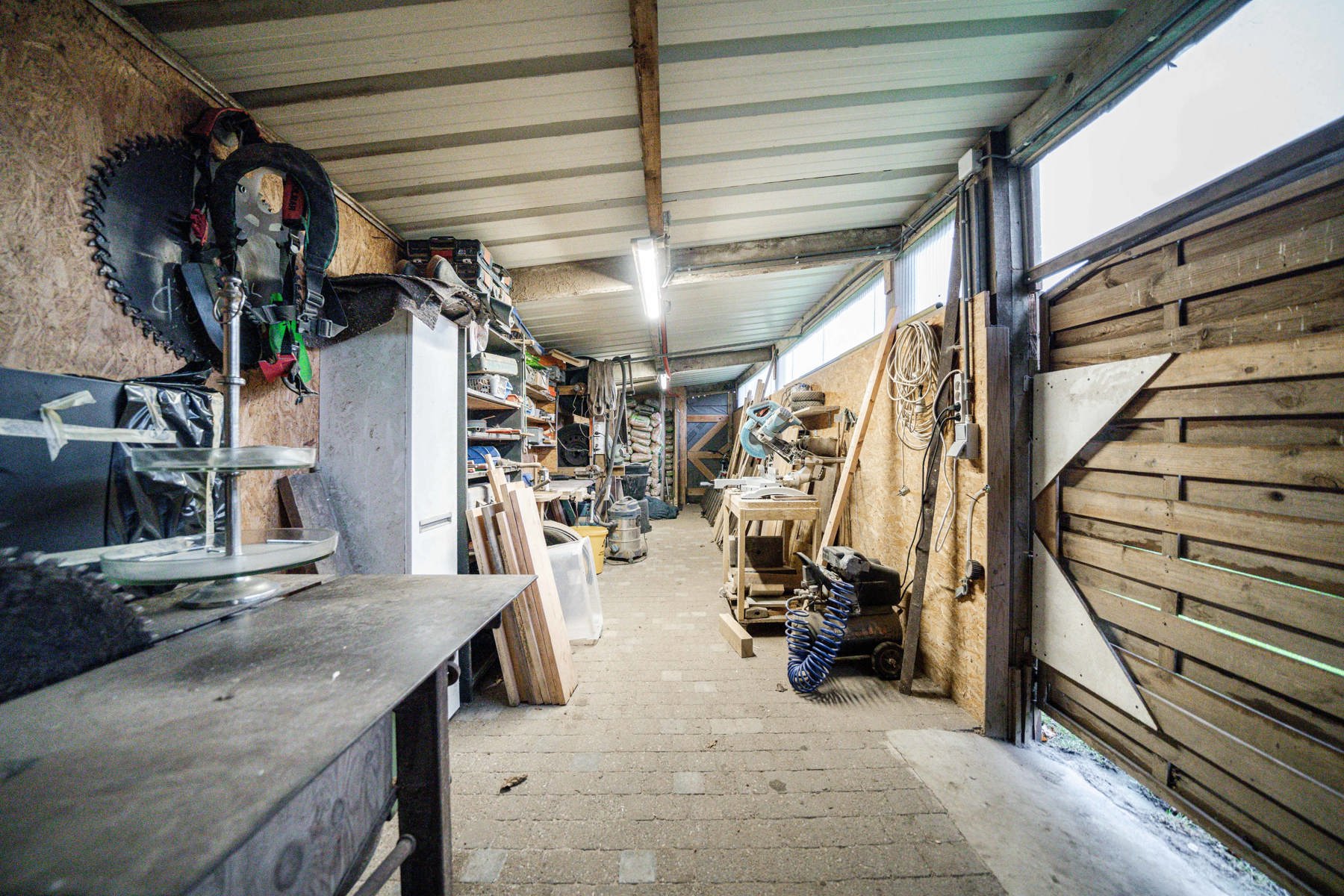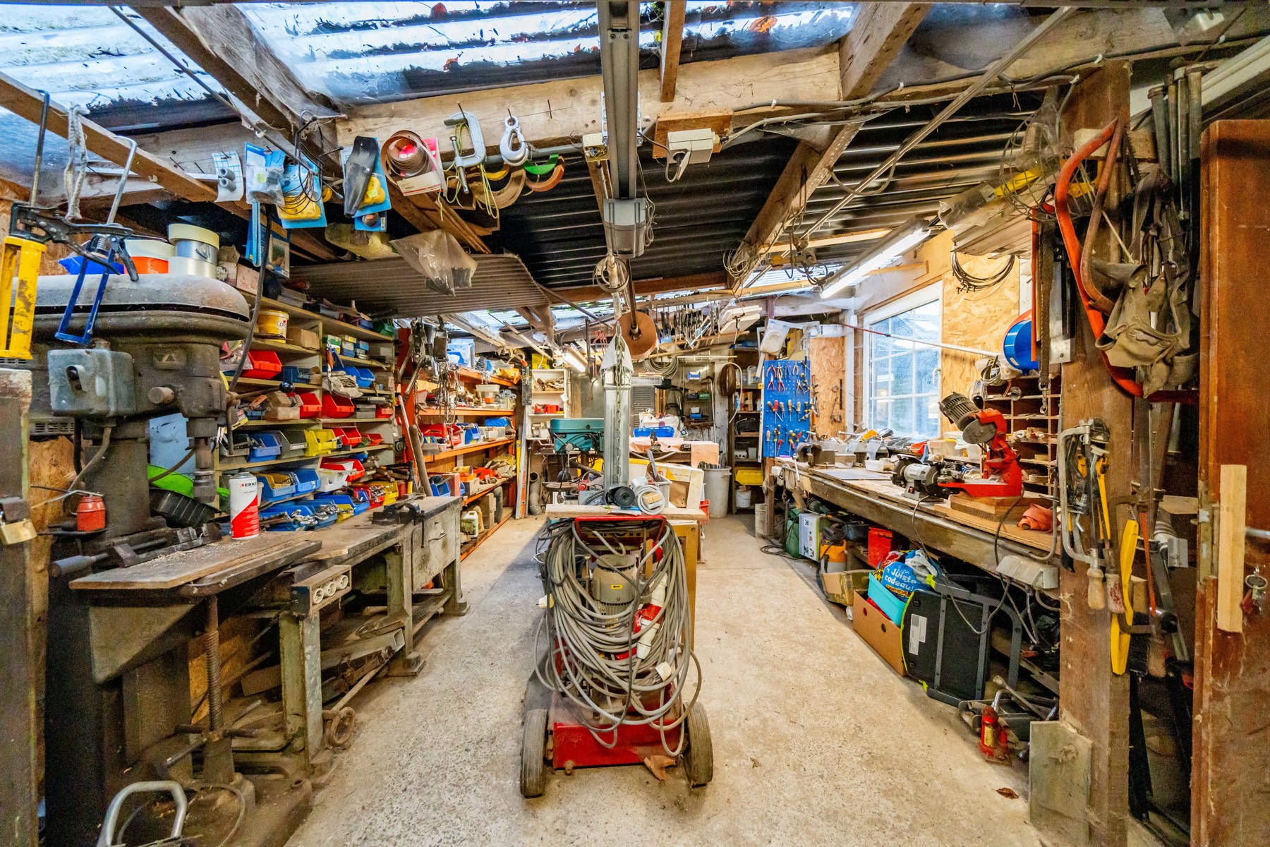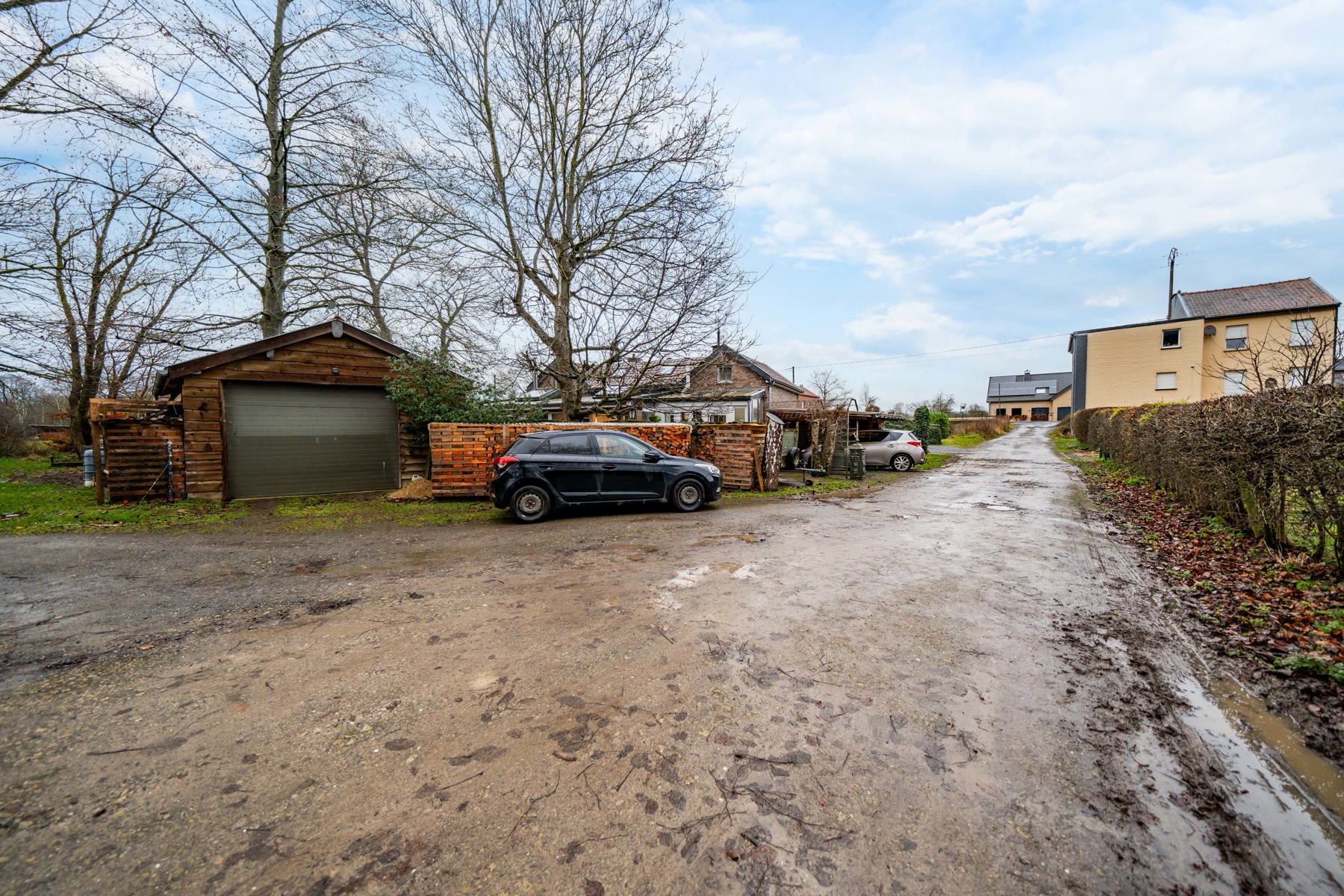Située en retrait de la route, maison 5 chambres avec grand jardin, deux garages, un carport et des ateliers.