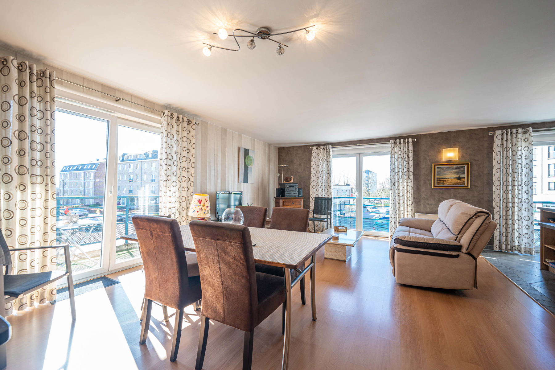 Situé au premier étage d’une résidence sans ascenseur, cet appartement comprend un hall d’entrée avec WC séparé, un salon/salle à manger ouvert sur une cuisine équipée, deux chambres, une buanderie ainsi qu’une salle de bains avec douche. Un balcon, un garage et un emplacement de parking complètent l'ensemble.