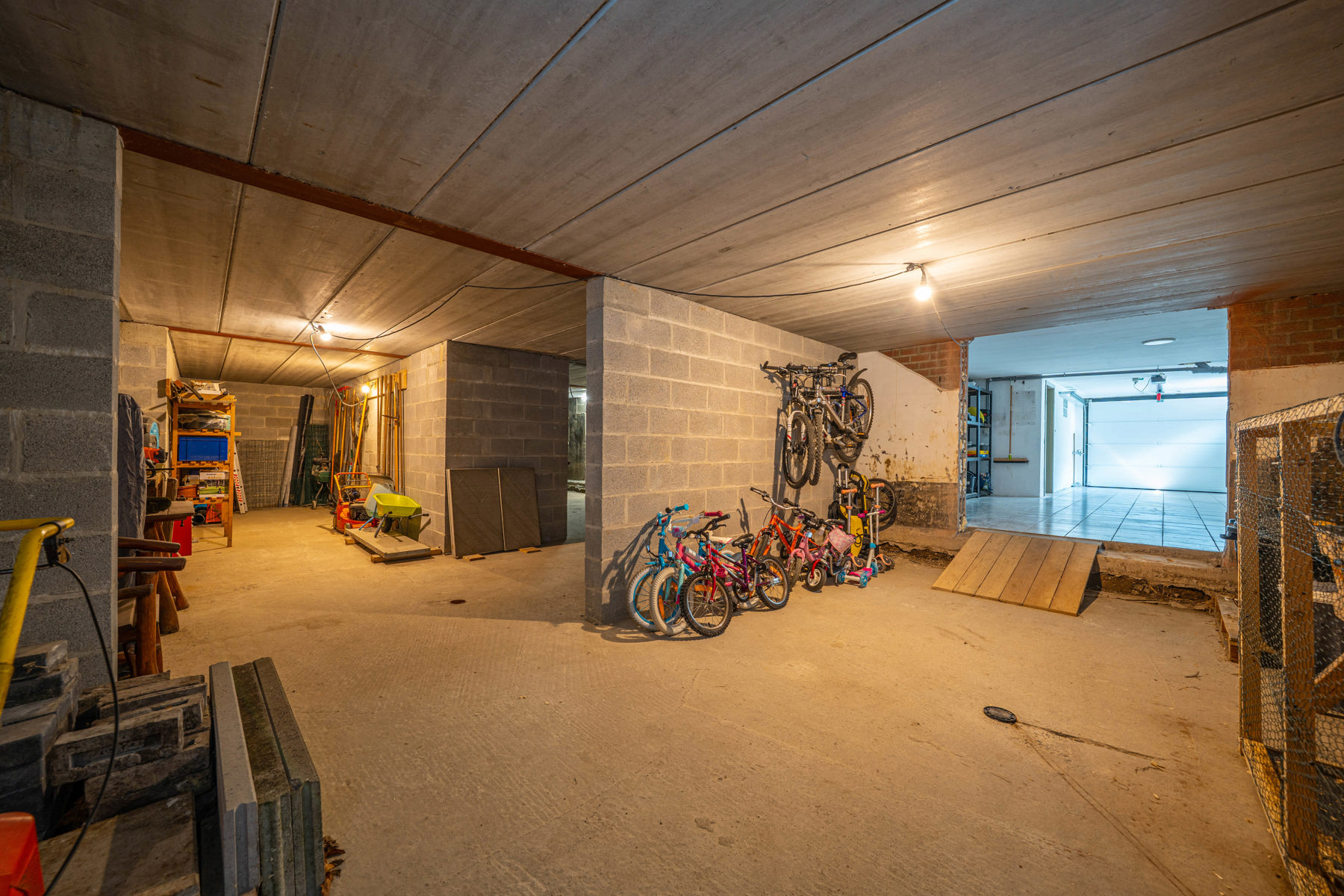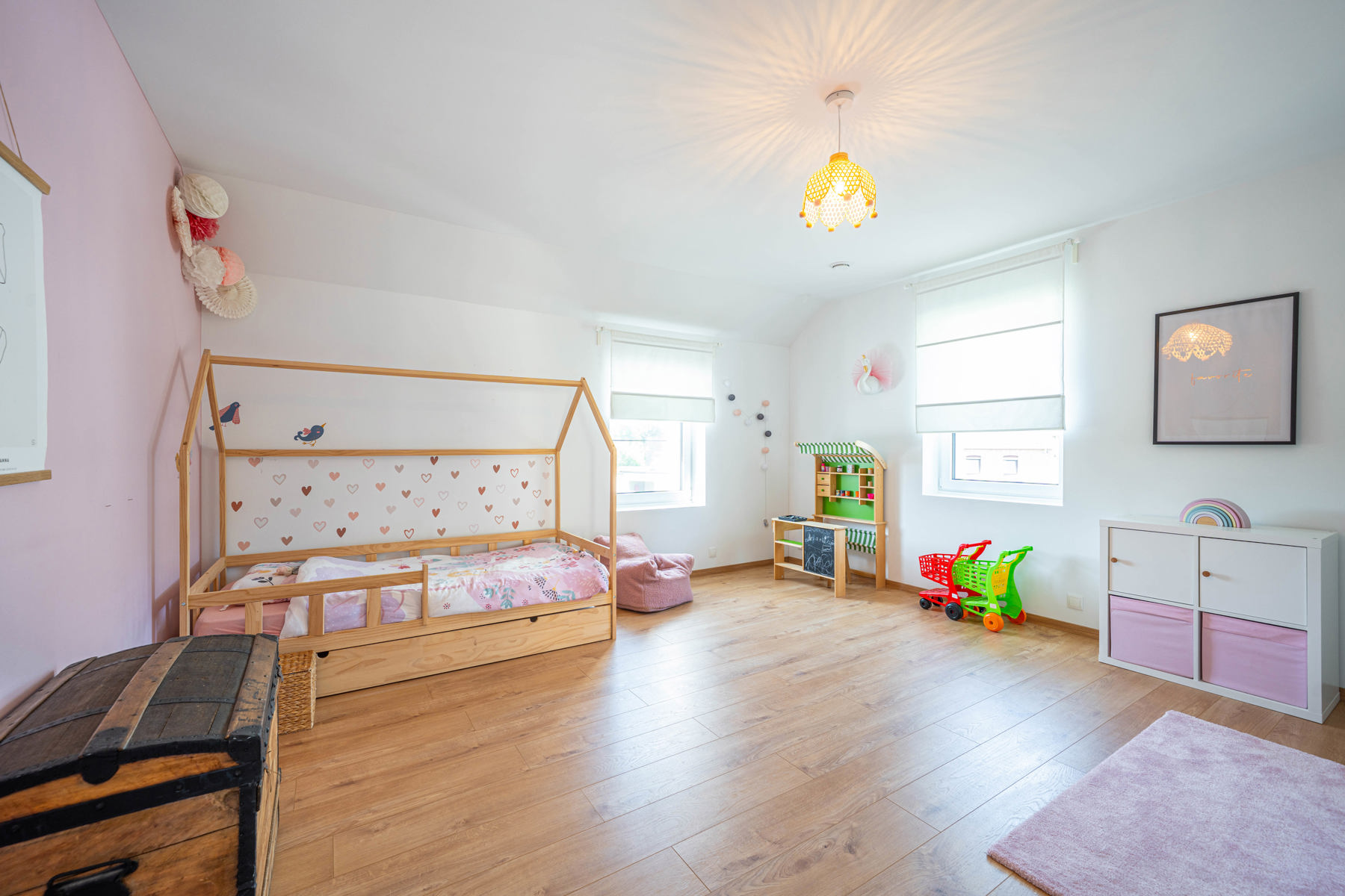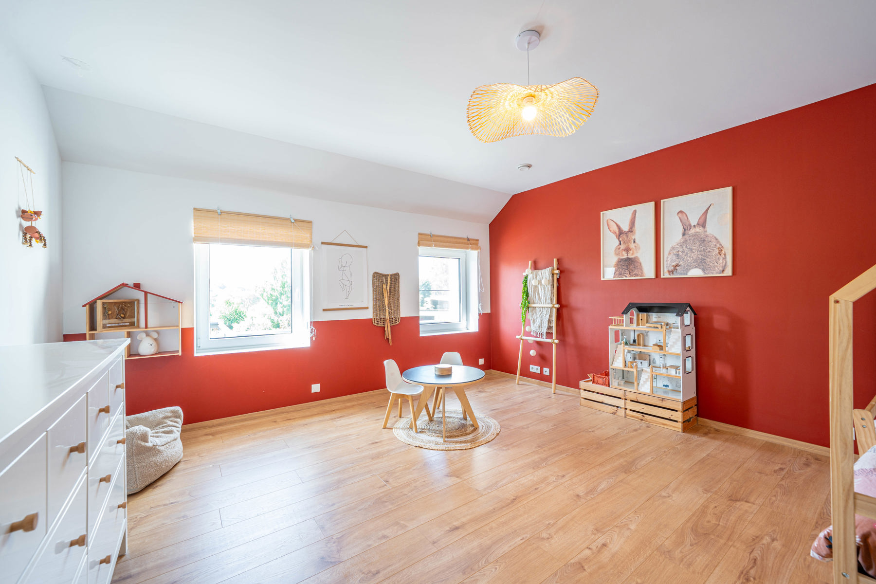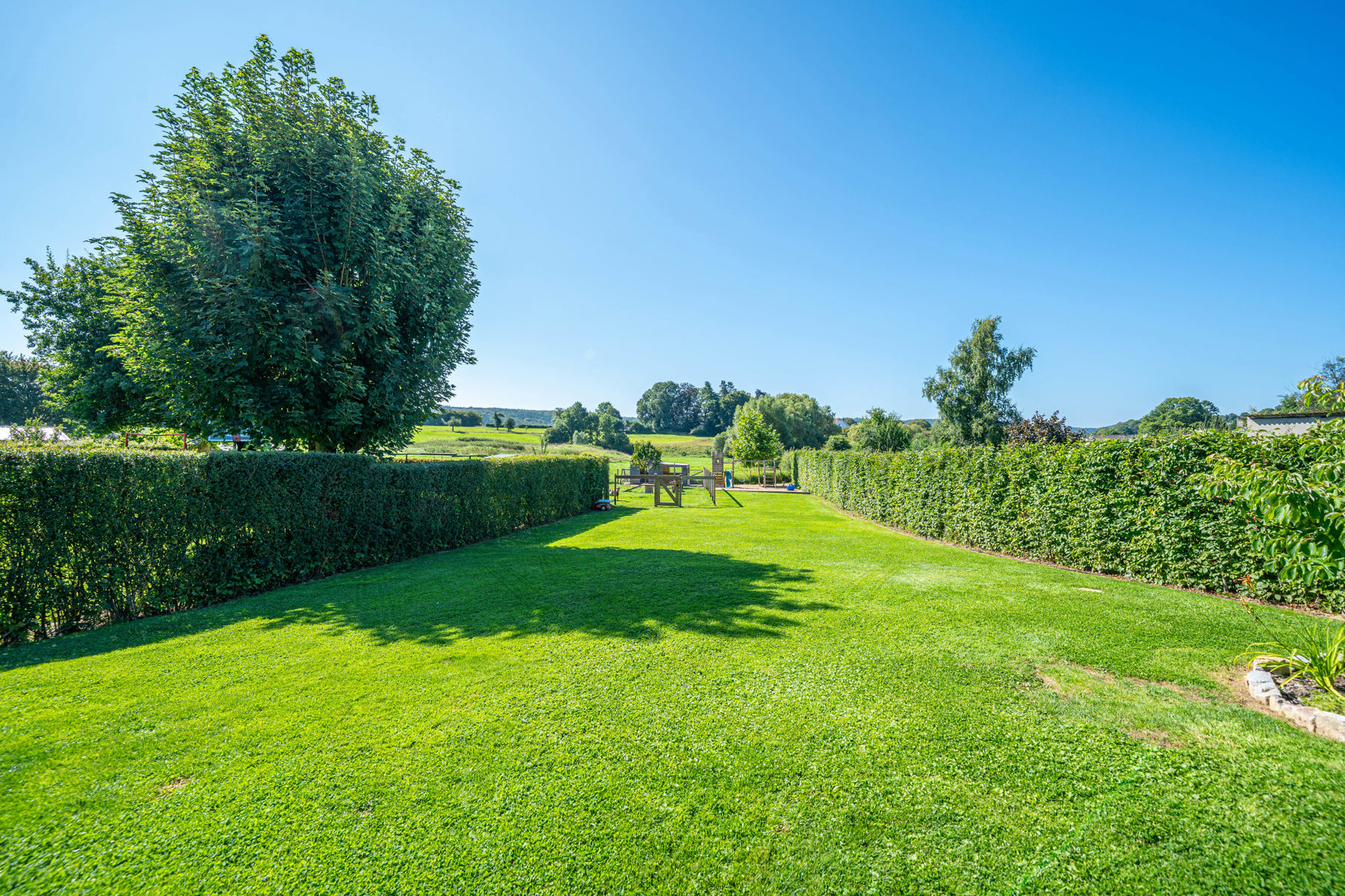 Le rez-de-chaussée se compose d'un spacieux hall d'entrée avec WC séparé, d'un lumineux espace de vie de 68m² avec cuisine équipée et donnant accès à la terrasse, de deux chambres dont une avec accès direct vers l’extérieur, d'un bureau (poss. chambre) ainsi que d'une buanderie. À l’étage, le hall de nuit dessert 4 grandes chambres, une salle de bains et une pièce de rangement. Un garage, de vastes caves (idéal pour un indépendant), un grenier et un jardin idéalement orienté sud complètent l’ensemble.