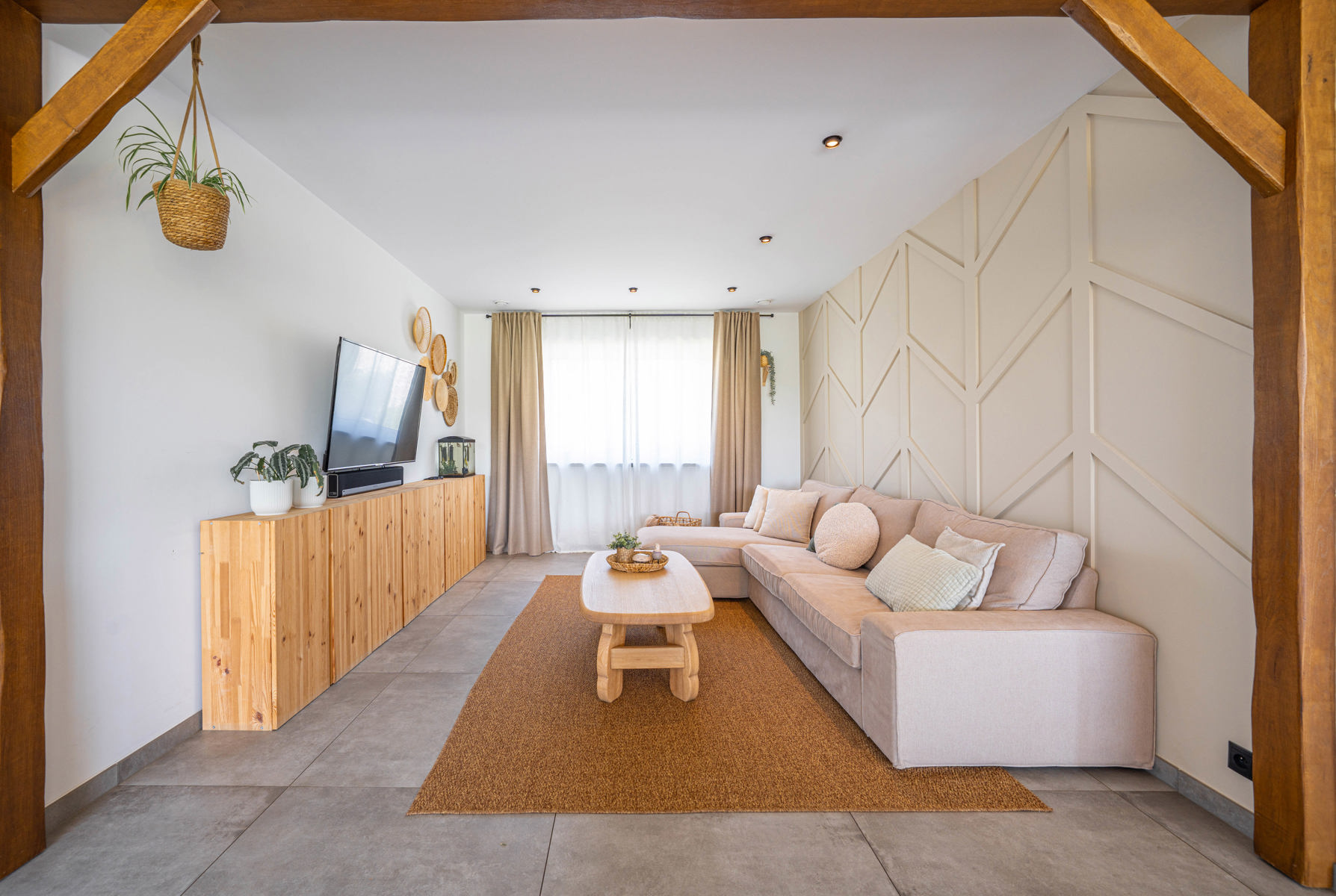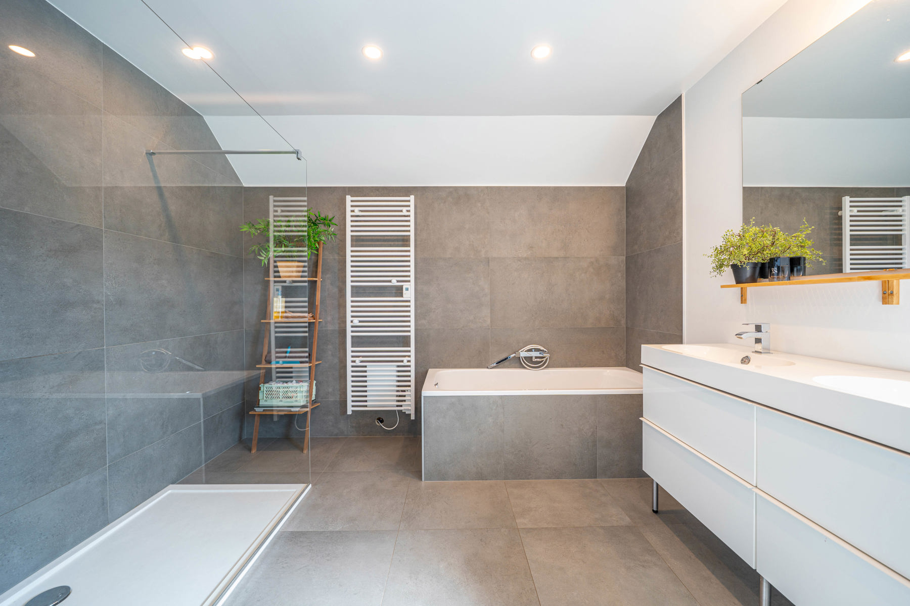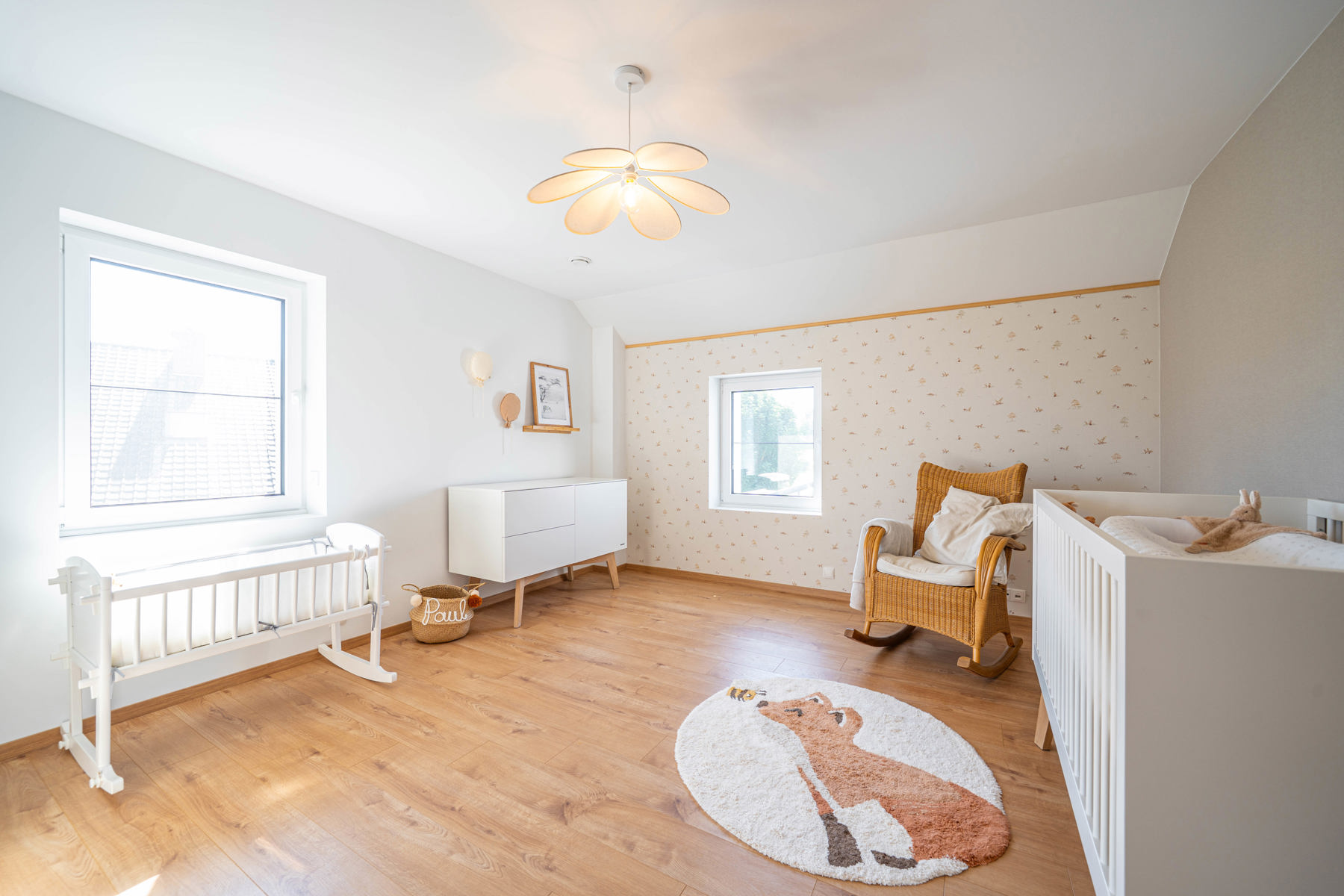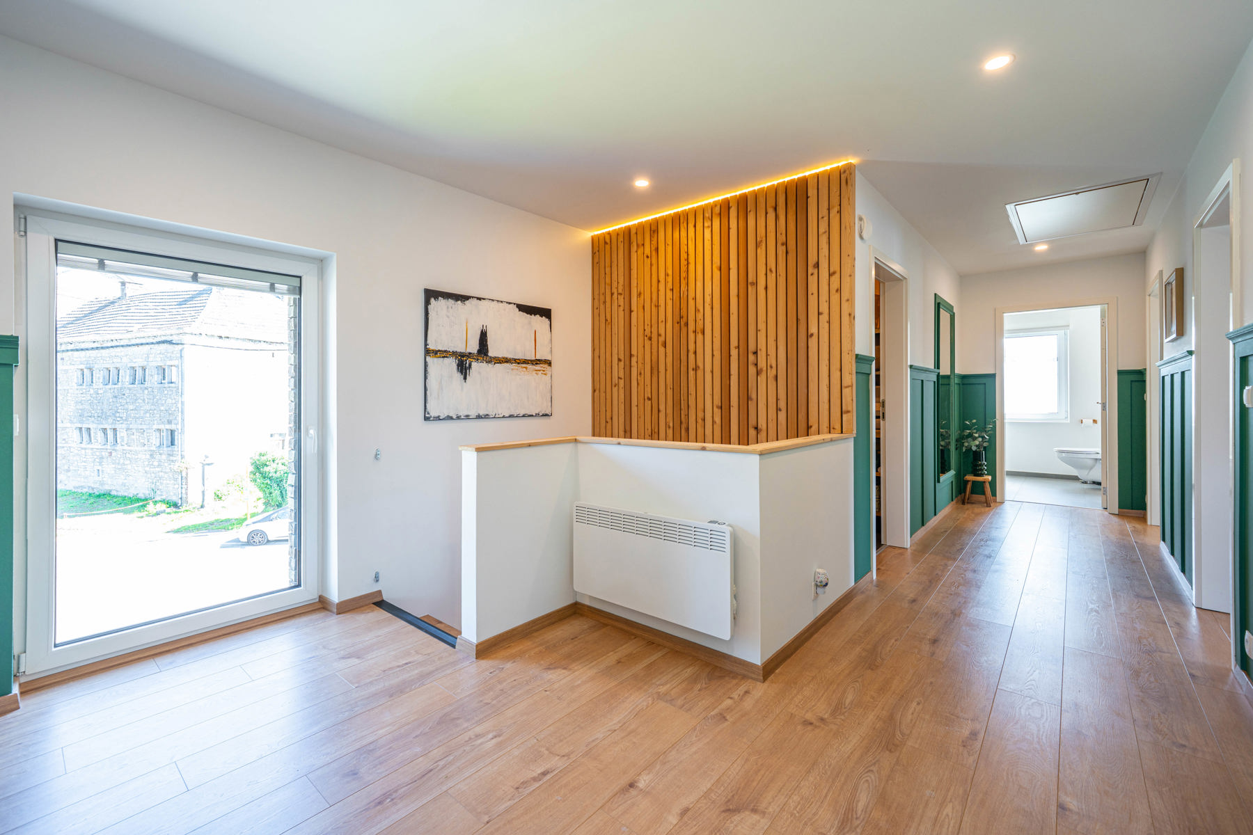 Le rez-de-chaussée se compose d'un spacieux hall d'entrée avec WC séparé, d'un lumineux espace de vie de 68m² avec cuisine équipée et donnant accès à la terrasse, de deux chambres dont une avec accès direct vers l’extérieur, d'un bureau (poss. chambre) ainsi que d'une buanderie. À l’étage, le hall de nuit dessert 4 grandes chambres, une salle de bains et une pièce de rangement. Un garage, de vastes caves (idéal pour un indépendant), un grenier et un jardin idéalement orienté sud complètent l’ensemble.