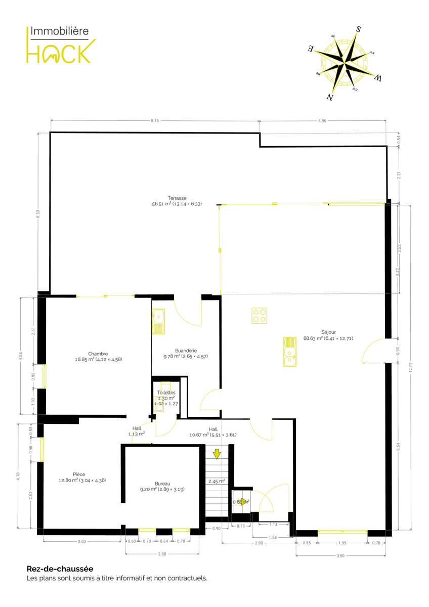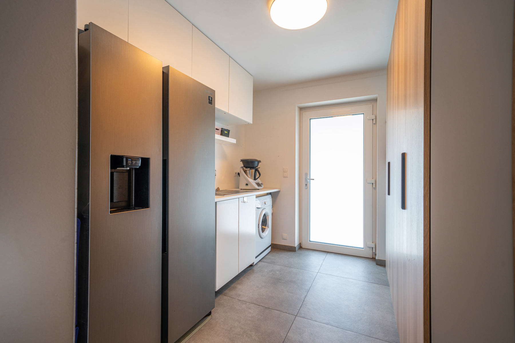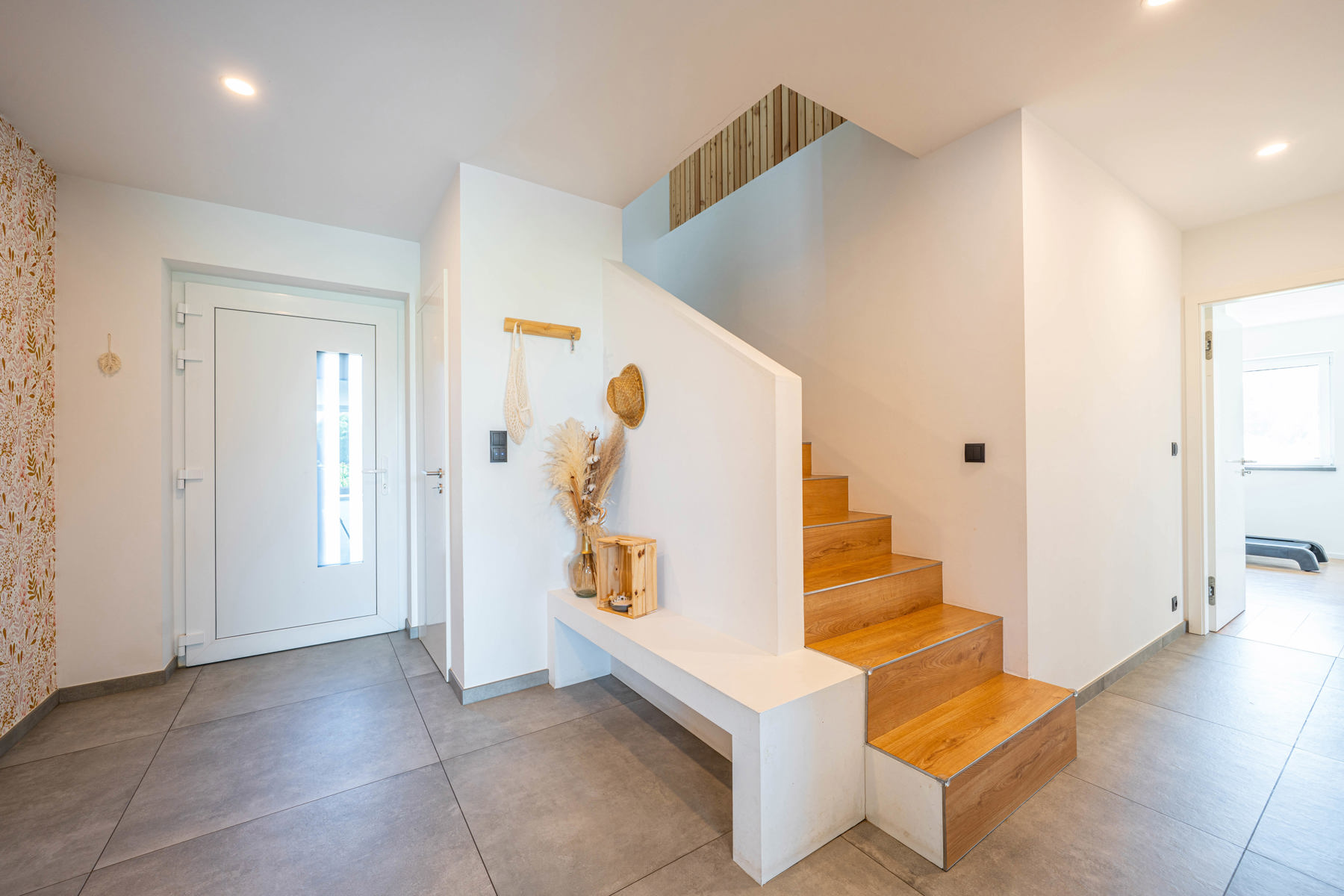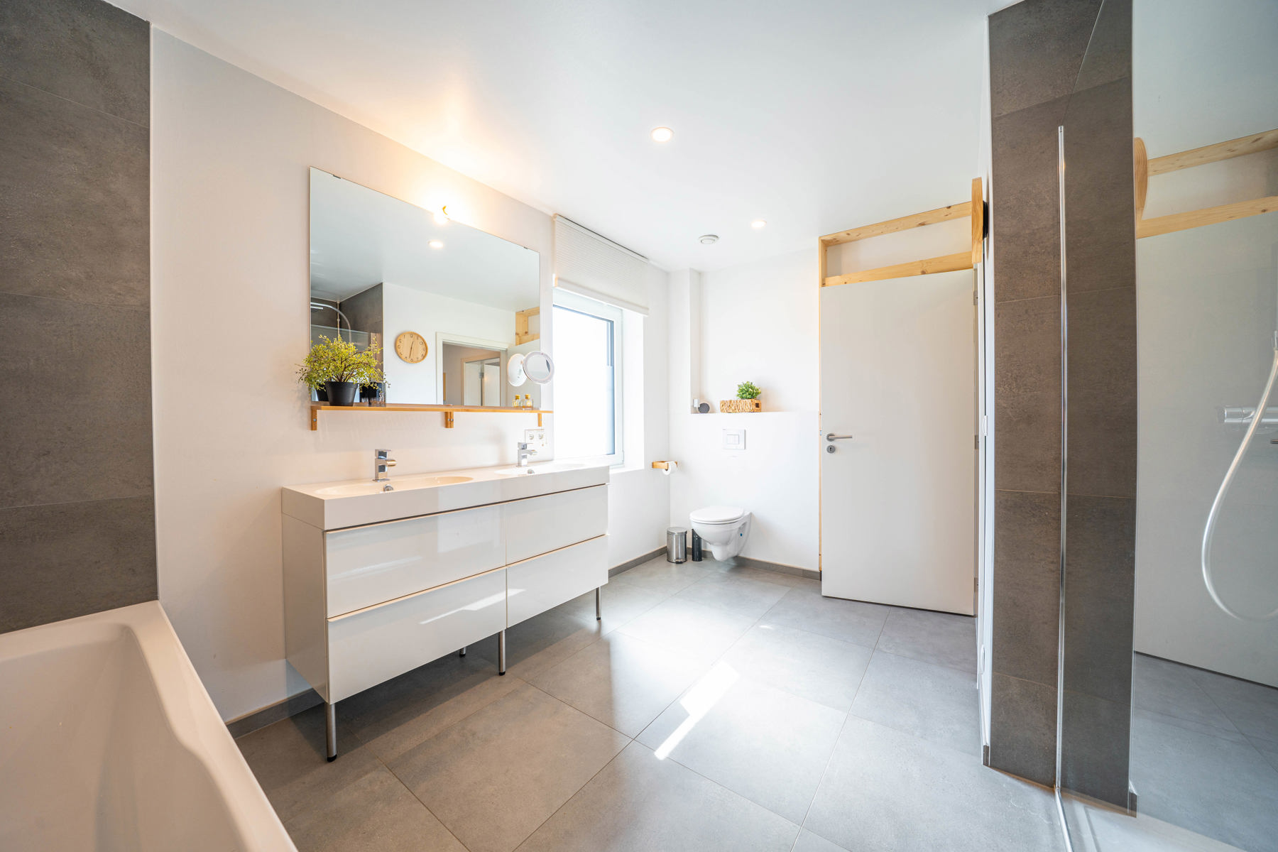 Le rez-de-chaussée se compose d'un spacieux hall d'entrée avec WC séparé, d'un lumineux espace de vie de 68m² avec cuisine équipée et donnant accès à la terrasse, de deux chambres dont une avec accès direct vers l’extérieur, d'un bureau (poss. chambre) ainsi que d'une buanderie. À l’étage, le hall de nuit dessert 4 grandes chambres, une salle de bains et une pièce de rangement. Un garage, de vastes caves (idéal pour un indépendant), un grenier et un jardin idéalement orienté sud complètent l’ensemble.