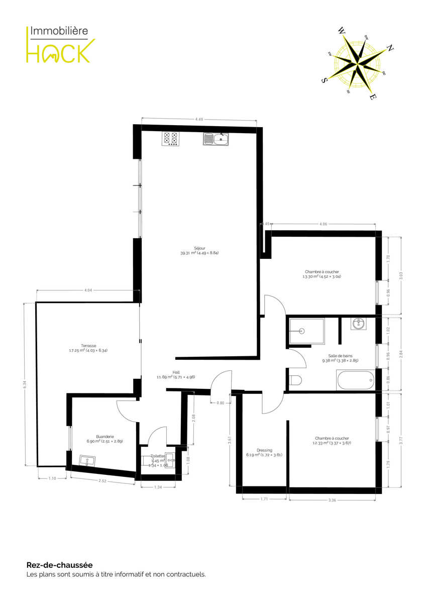 L'appartement se compose d’un hall d’entrée avec WC, d’un séjour lumineux donnant sur la terrasse, d’une cuisine ouverte et équipée, de deux chambres, d’une salle de bains ainsi que d’une buanderie.
