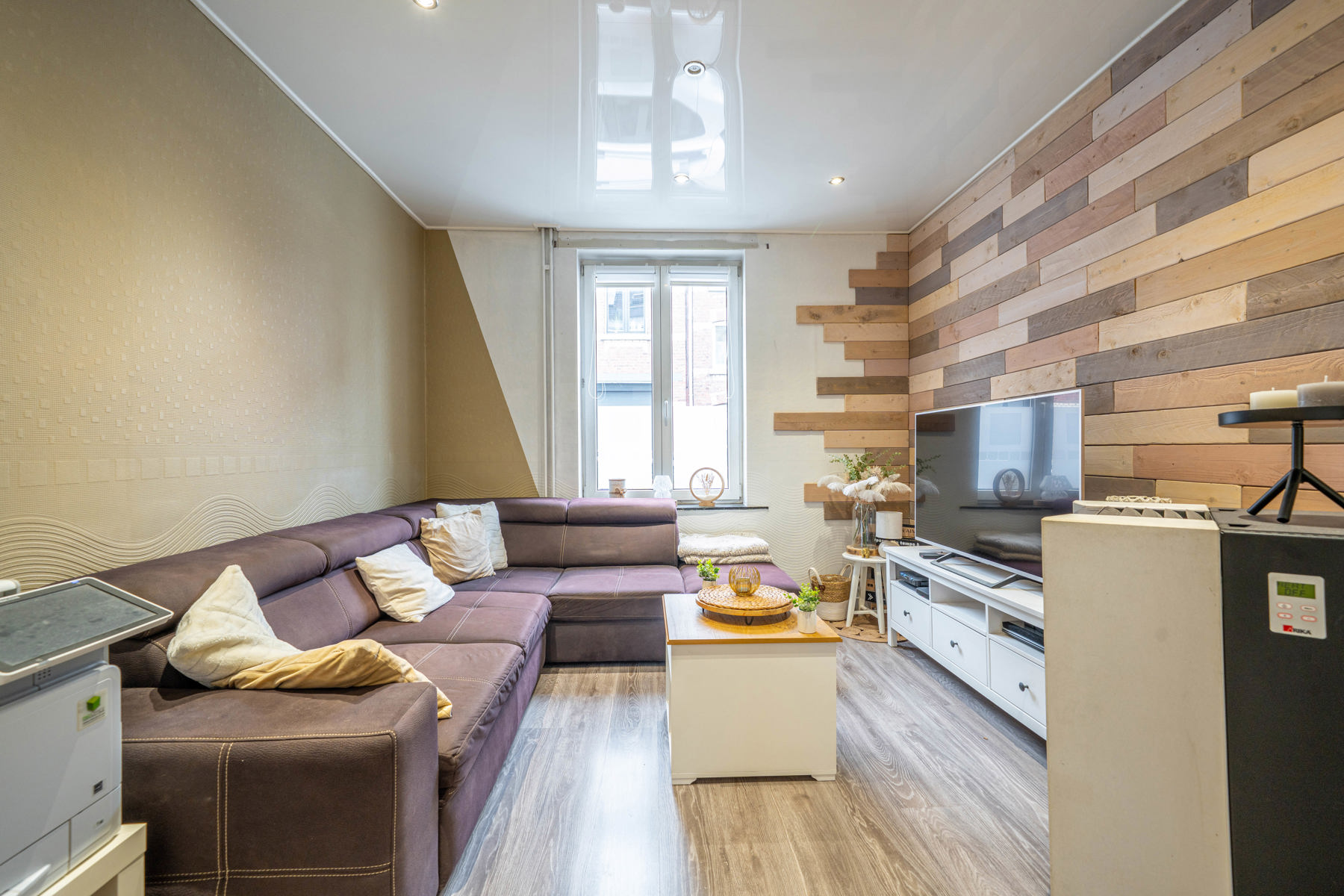 Le bien se compose, au rez-de-chaussée, d’un hall d’entrée et d’un espace ouvert comprenant le salon, la salle à manger et la cuisine équipée donnant accès à la terrasse de 15,25m². Le premier étage comprend une chambre de 15,11m² ainsi qu’une salle de bains équipée d’une baignoire et d’une douche. Le deuxième étage offre deux chambres de 15,96m² et 10,61m². Au sous-sol, trois caves complètent l'ensemble.