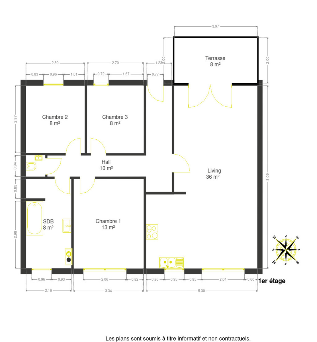 Situé au premier étage d'une résidence calme sans ascenseur, cet appartement se compose d'un hall d'entrée, d'un lumineux séjour avec cuisine équipée donnant accès à la terrasse, de trois chambres, d'un WC et d'une salle de bains.