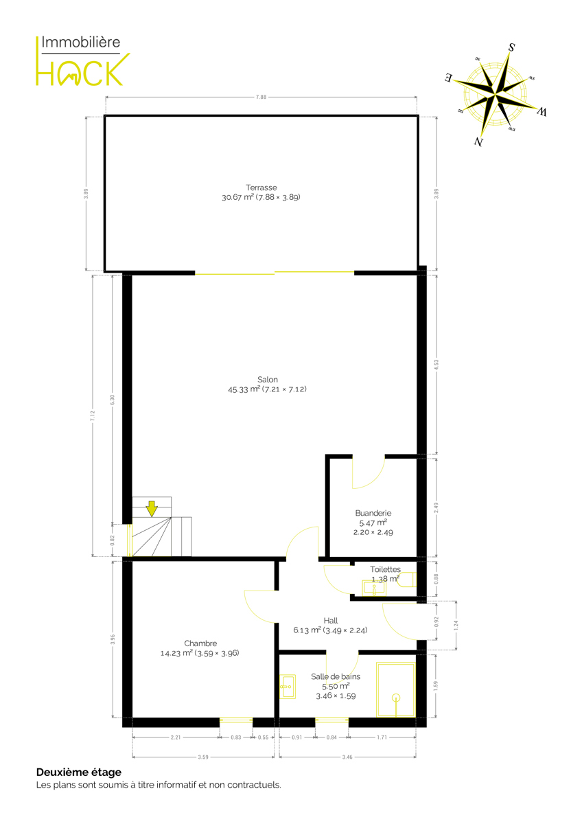 Niché au deuxième étage d'une résidence composée de quatre logements desservi par un ascenseur, ce duplex se compose au premier niveau d'un sas d'entrée conduisant à un grand et lumineux séjour intégrant une cuisine avec ilot ouvrant sur une terrasse généreusement dimensionnée. Un W.C, une première salle de bains, une lumineuse chambre et une buanderie complètent ce niveau. Accessible par un escalier, le deuxième niveau se compose d'un hall de nuit desservant deux chambres et une seconde salle de bains avec douche à l'italienne. Une cave privative ainsi que deux emplacements de parking (intérieur et extérieur) complètent ce magnifique bien.