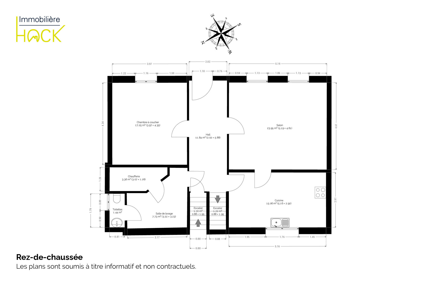 Le rez-de-chaussée se compose d’un hall d’entrée, d’un séjour lumineux, d'une cuisine équipée, d'une chambre, d’une buanderie, d'une chaufferie ainsi que d'un WC. À l’étage, le hall de nuit dessert 3 chambres et une salle de bain (douche et bain). Un jardin, une terrasse, des caves et un grenier complètent l'ensemble.