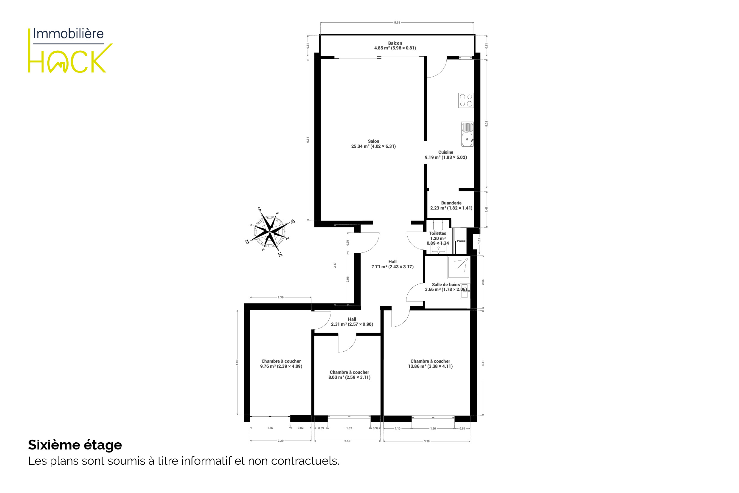 Niché au 6ième étage de la Résidence "Deux Rivières", ce bien rénové entièrement en 2018 se compose d’un hall d’entrée avec W.C. indépendant, d’un vaste séjour baigné de lumière et orienté Sud-Ouest, d’une cuisine, d'une buanderie, d’une salle de bains et de trois chambres. Une cave et une place de parking intérieure complètent l’ensemble.
