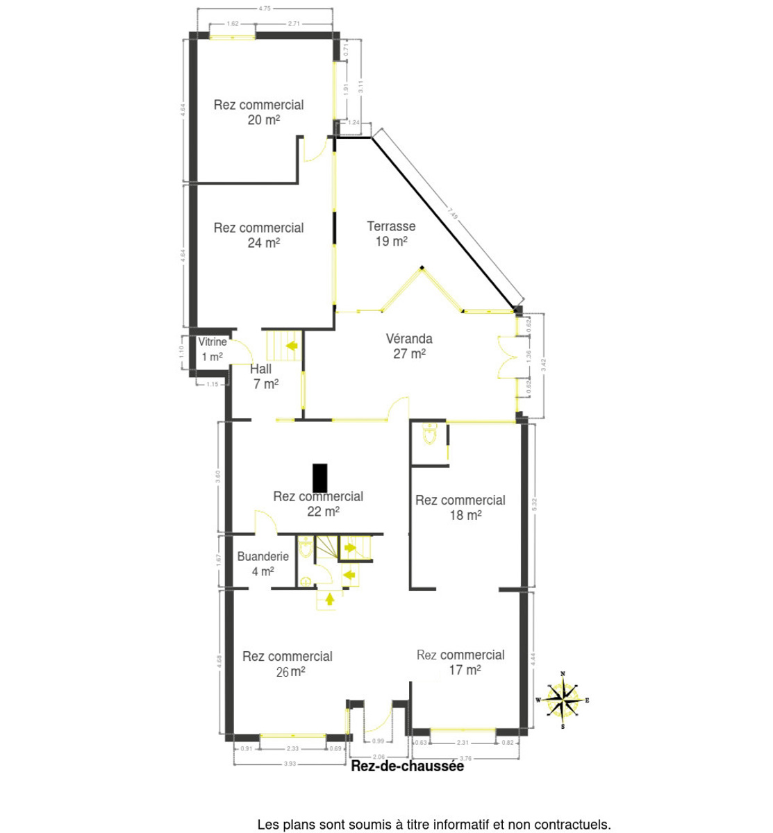 Ce bien atypique et de charme se compose au rez-de-chaussée d’une grande surface commerciale de 83 m² avec une véranda de 27m² et une terrasse de 19m², ainsi que de deux vastes pièces polyvalentes de 44 m² pouvant servir de bureaux, de stockage ou autre. Au premier étage, un hall dessert quatre pièces, deux salles d’eau et un espace cuisine pour un total de 111 m². Au deuxième étage, un grenier de 14 m². Au sous-sol de grandes caves pour un total de 103m² complètent l'ensemble.